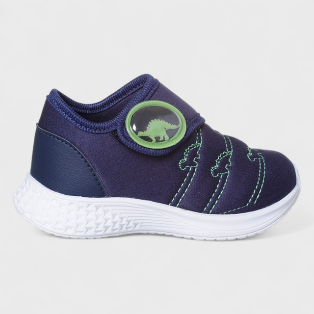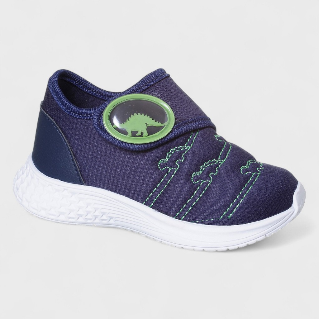 TABELA DE MEDIDAS N° 22 - 14,5 cm N° 23 - 15,3 cm N° 24 - 15,8 cm N° 25 - 16,5 cm N° 26 - 17 cm N° 27 - 17,8 cm Tênis Infantil Masculino Calce Fácil Dinossauro Marinho A sola branca em EVA é leve e antiderrapante, oferecendo mais segurança durante as atividades. O detalhe do emborrachado com enfeite de dinossauro trás muito estilo e diversão aos pequenos. Disponível nas numerações do 22 ao 27, é uma excelente opção para quem busca um calçado versátil e estiloso para diversas ocasiões.