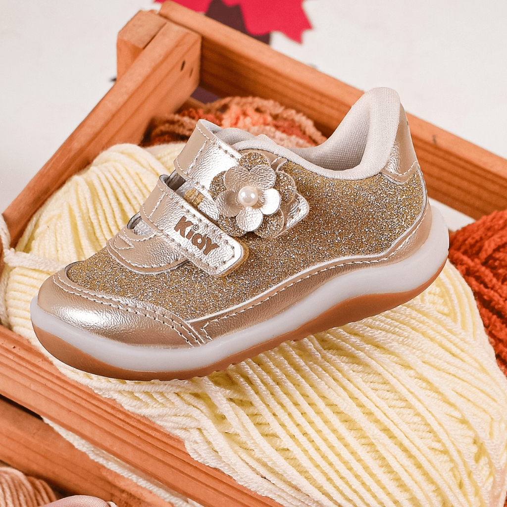 : Descrição Com um design delicado e funcionalidades inteligentes, este tênis é um aliado no desenvolvimento saudável e confortável dos pezinhos. Com tons em dourado, este modelo une tendencias do metalizado e glitter, para montar looks estilosos e leves ao mesmo tempo. O design anatômico e a palmilha medidora garantem um ajuste perfeito, acompanhando o ritmo do crescimento dos pés. Além disso, nossa tecnologia do equilíbrio proporciona estabilidade e segurança, incentivando a confiança durante os primeiros passos. Cada detalhe deste tênis foi cuidadosamente pensado para oferecer conforto e proteção, enquanto estimula o desenvolvimento saudável dos pés com estilo, conforto e diversão. Como medir o pezinho? No momento de comprar um novo calçado para a criança , um dos pontos mais importantes é a escolha da numeração. E pensando nisso, trouxemos um vídeo explicativo para juntos aprendermos a medir o pezinho dos pequenos e assim tentar evitar a troca ou os apertos. Siga o passo a passo e escolha a numeração mais adequada. Formato Anatômico Sempre pensando na saúde e conforto das crianças, todos os calçados Kidy possuem formato anatômico que auxilia no crescimento e desenvolvimento saudável dos pés. Tamanhos: do 16 ao 22; Fechamento: Fita Aderente Cabedal: Napa / Metalizado / Glitter Forro: Têxtil Absorvente Palmilha: Medidora Anatômica Sola: TR Antiderrapante Anatômica