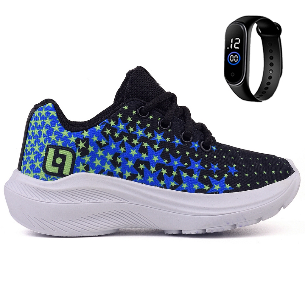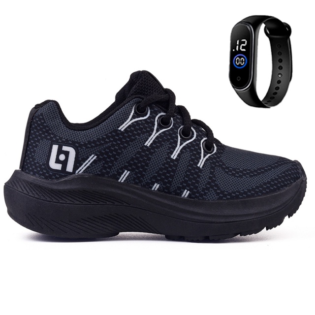 Tenis Infantil Meninos Casual Escolar Preto Preto + Relogio