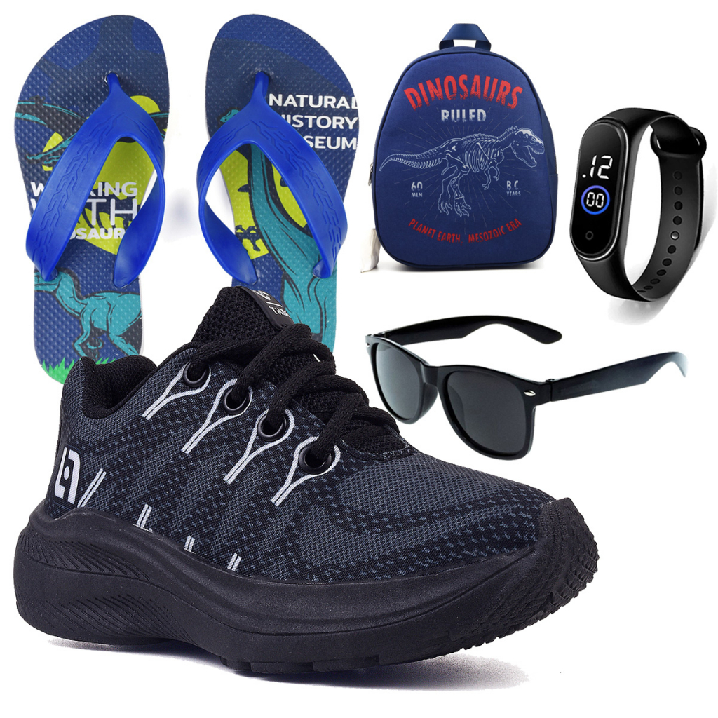 Tenis Infantil Meninos Casual Preto Preto + Mochila Chinelo Óculos e Relógio Anna Calcados