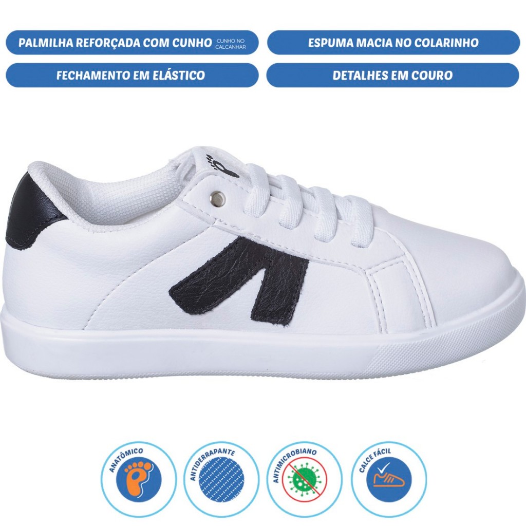 O Casual é moderno, arrojado e com uma combinação de cor que é perfeita para deixar os pequenos cheios de estilo no dia-a-dia! É anatômico, todo almofadado e com solado antiderrapante que permite que os meninos tenham conforto, firmeza e segurança para correr e brincar de montão. **********TABELA DE MEDIDAS*********** 25 ------------------ 18,20 cm 26 ------------------ 18,40 cm 27 ------------------ 19,00 cm 28 ------------------ 19,20 cm 29 ------------------ 20,20 cm 30 ------------------ 20,40 cm 31 ------------------ 21,70 cm 32 ------------------ 21,90 cm 33 ------------------ 23,20 cm 34 ------------------ 23,40cm 35 ------------------ 24,70cm 36 ------------------ 24,90cm OBS: À cada medida feita, adicione pelo menos meio centímetro para que o pé fique confortável no calçado. Afinal, nenhum sapato fica exatamente do mesmo tamanho dos pés. DETALHES DO PRODUTO Fechamento: Elástico Material Externo: Sintético Material Interno: Têxtil Material da Palmilha: Têxtil Material da Sola: Borracha Tr Cor: Branco Preto Azul Marinho Altura do cano: Baixo