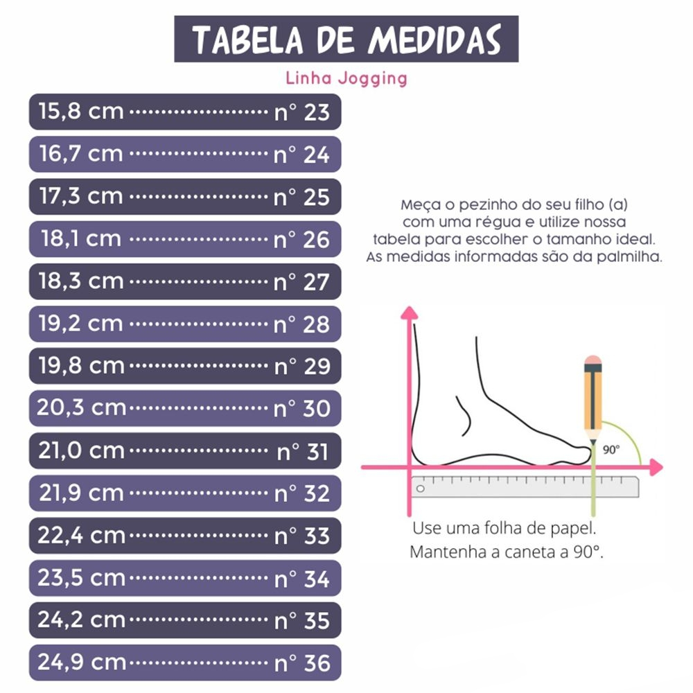 O tênis Jogging é perfeito para a rotina escolar! É confeccionado em materiais resistem, duradouros e que permitem uma limpeza rápida e fácil. Tem fechamento em velcro, espuma fofinha no colarinho, solado antiderrapante e palmilha anatômica. Muito conforto, praticidade e segurança para a meninada aproveitar ao máximo a escola. **********TABELA DE MEDIDAS*********** 23 ------------------ 15,80 cm 24 ------------------ 16,70 cm 25 ------------------ 17,30 cm 26 ------------------ 18,10 cm 27 ------------------ 18,30 cm 28 ------------------ 19,20 cm 29 ------------------ 19,80 cm 30 ------------------ 20,30 cm 31 ------------------ 21,00 cm 32 ------------------ 21,90 cm 33 ------------------ 22,40 cm 34 ------------------ 23,50 cm 35 ------------------ 24,20 cm 36 ------------------ 24,90 cm OBS: Colocar o pé da criança no chão, medir, acrescentar pelo menos 1cm à essa medida e depois seguir a tabela. As medidas fornecidas são da palmilha. DETALHES DO PRODUTO Fechamento: Velcro e Elástico Material Externo: Sintético Material Interno: Têxtil Material da Palmilha: Têxtil Material da Sola: Borracha Tr Cor: Preto - Preto/Pink - Rosa