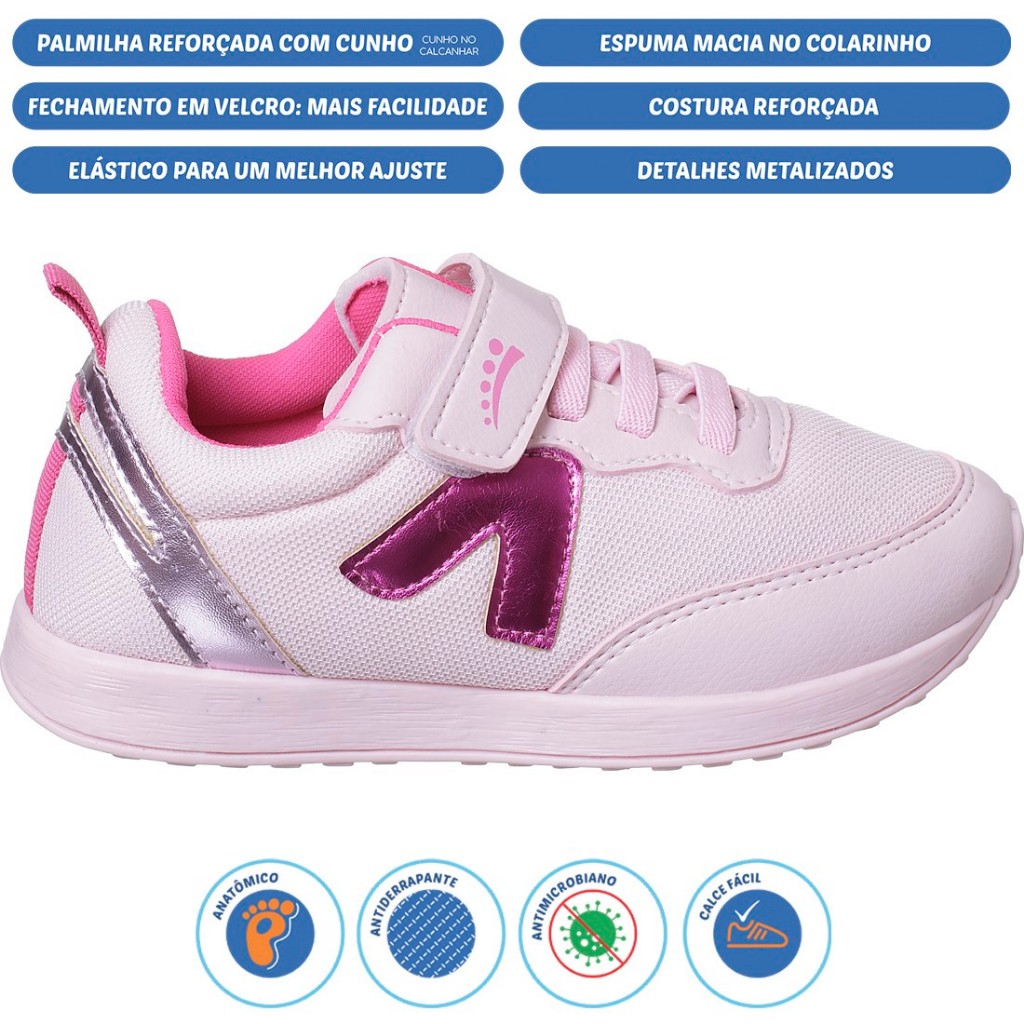 O tênis Jogging é perfeito para a rotina escolar! É confeccionado em materiais resistem, duradouros e que permitem uma limpeza rápida e fácil. Tem fechamento em velcro, espuma fofinha no colarinho, solado antiderrapante e palmilha anatômica. Muito conforto, praticidade e segurança para a meninada aproveitar ao máximo a escola. **********TABELA DE MEDIDAS*********** 23 ------------------ 15,80 cm 24 ------------------ 16,70 cm 25 ------------------ 17,30 cm 26 ------------------ 18,10 cm 27 ------------------ 18,30 cm 28 ------------------ 19,20 cm 29 ------------------ 19,80 cm 30 ------------------ 20,30 cm 31 ------------------ 21,00 cm 32 ------------------ 21,90 cm 33 ------------------ 22,40 cm 34 ------------------ 23,50 cm 35 ------------------ 24,20 cm 36 ------------------ 24,90 cm OBS: Colocar o pé da criança no chão, medir, acrescentar pelo menos 1cm à essa medida e depois seguir a tabela. As medidas fornecidas são da palmilha. DETALHES DO PRODUTO Fechamento: Velcro e Elástico Material Externo: Sintético Material Interno: Têxtil Material da Palmilha: Têxtil Material da Sola: Borracha Tr Cor: Preto - Preto/Pink - Rosa