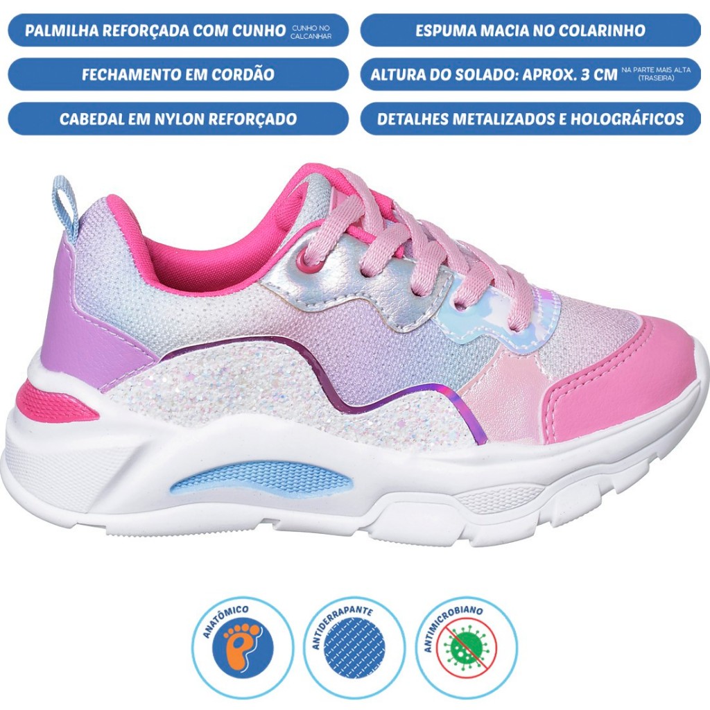 O tênis Wave é ideal para os pequenos brincarem e correrem de montão. É anatômico, fácil de calçar e o solado é super levinho. É confeccionado em tecidos que permitem que os pezinhos respirem e se movimentem com liberdade. Tabela de Medida 27 ------- 18,60CM 28 ------- 19,00CM 29 ------- 19,70CM 30 ------- 20,00CM 31 ------- 20,90CM 32 ------- 21,10CM 33 ------- 22,20CM 34 ------- 22,50CM 35 ------- 23,30CM 36 ------- 23,70CM OBS: Colocar o pé da criança no chão, medir, acrescentar pelo menos 1cm à essa medida e depois seguir a tabela. As medidas fornecidas são da palmilha. DETALHES DO PRODUTOFechamento: CadarçoMaterial Externo: Sintético e Têxtil Material Interno: TêxtilMaterial da Palmilha: TêxtilMaterial da Sola: PVC Expandido Cor: Rosa Colorido Glitter Altura do cano: Baixo