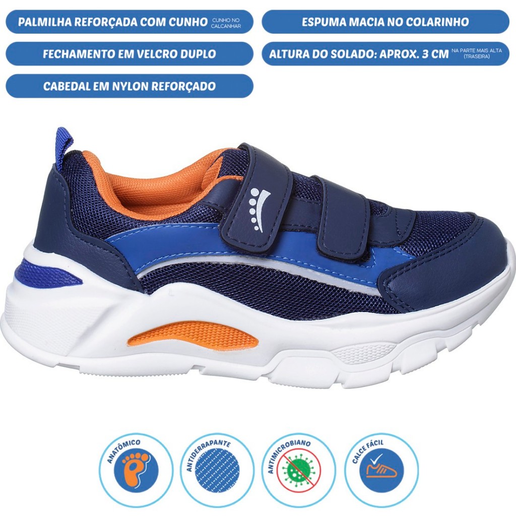 O tênis Wave é ideal para os pequenos brincarem e correrem de montão. É anatômico, fácil de calçar e o solado é super levinho. É confeccionado em tecidos que permitem que os pezinhos respirem e se movimentem com liberdade. Tabela de Medida 27 ------- 18,60CM 28 ------- 19,00CM 29 ------- 19,70CM 30 ------- 20,00CM 31 ------- 20,90CM 32 ------- 21,10CM 33 ------- 22,20CM 34 ------- 22,50CM 35 ------- 23,30CM 36 ------- 23,70CM OBS: Colocar o pé da criança no chão, medir, acrescentar pelo menos 1cm à essa medida e depois seguir a tabela. As medidas fornecidas são da palmilha. DETALHES DO PRODUTO Fechamento: Velcro Material Externo: Sintético e Têxtil Material Interno: Têxtil Material da Palmilha: Têxtil Material da Sola: PVC Expandido Cor: Azul Marinho Altura do cano: Baixo