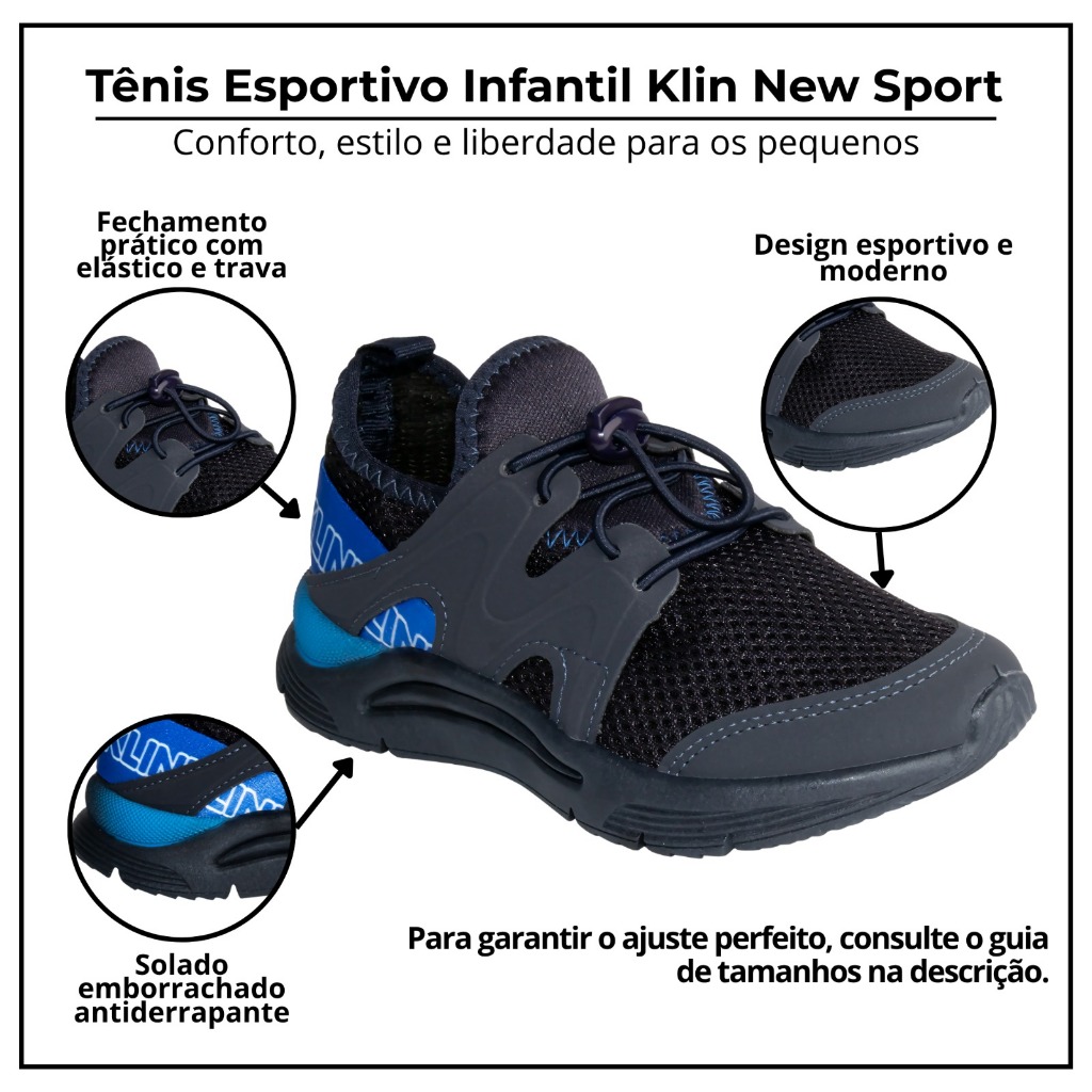 Tênis Klin Infantil Esporte Escola Conforto Original – Leve, Durável e Estiloso 📌 Descrição do Produto O Tênis Klin Infantil Original é a escolha perfeita para escola, esporte, lazer e passeios. Desenvolvido com design moderno, solado antiderrapante e material respirável, garante segurança, conforto e durabilidade para acompanhar o ritmo das crianças. Ideal para atividades escolares, educação física, corrida e brincadeiras, este tênis esportivo infantil combina leveza, praticidade e estilo. Com fechamento prático em elástico com trava, é fácil de calçar, proporcionando um ajuste perfeito e seguro. A marca Klin é reconhecida pela qualidade e resistência de seus calçados, oferecendo o melhor em tênis escolar infantil e tênis casual infantil. ✨ Principais Vantagens 👟 Conforto extremo – Palmilha macia para uso diário 🏃♂️ Ideal para esporte e escola – Perfeito para correr, brincar e estudar 🌀 Material respirável – Evita suor excessivo e mantém os pés frescos 🧼 Fácil de limpar – Mais praticidade para o dia a dia dos pais 🎯 Ajuste perfeito – Sistema de elástico e trava para vestir rapidamente 🔹 Design moderno e estiloso – Combina com qualquer look infantil 🛡 Produto original Klin – Marca referência em calçados infantis duráveis 📏 Tabela de Medidas Número (BR) - Comprimento do pé (cm) 26 - 17,0 cm 27 - 17,7 cm 28 - 18,4 cm 29 - 19,0 cm 30 - 19,7 cm 31 - 20,4 cm 32 - 21,0 cm 33 - 21,7 cm 34 - 22,4 cm 📌 Dica: Meça o pé da criança e adicione cerca de 0,5 cm para garantir conforto extra.