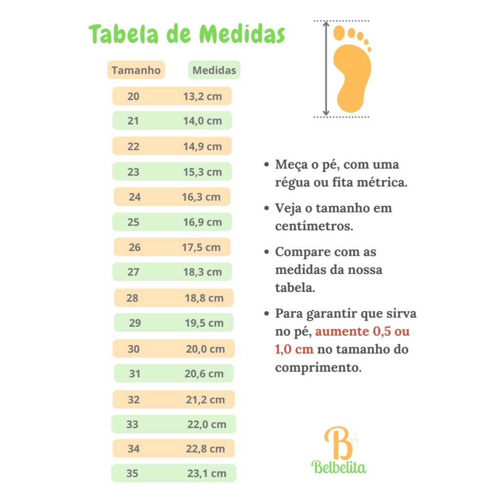 ✅ Tênis Super Macio e Confortável, perfeito para ser usado na escola, um passeio no parque ou no dia a dia, Super Moderna, fácil de combinar com vários looks, este tênis oferece o máximo conforto para os pezinhos em crescimento. ✅ O Detalhe do Puxador no Traseiro Facilita o Calce e ajuda na Autonomia e no desenvolvimento dos pequenos, com a sola antiderrapante,leve e flexível que proporciona segurança para seu príncipe se divertir e explorar pelo mundo magico. ✅ Possui um acabamento impecável, com cores vibrantes e estampas Perfeitas que certamente farão seus pequenos se apaixonar à primeira vista. ✅ Durabilidade Garantida: Costurado com precisão para resistir ao uso diário, este tênis é projetado para acompanhar suas pequenas exploradoras em todas as suas aventuras. Presenteie seus pequenos com esse tênis dos sonhos! Deixe seus filhos explorar o mundo, aproveitando o conforto e estilo incomparáveis que esse tênis infantil oferece. Afinal, eles merece apenas o melhor. Faça o pedido agora e proporcione a eles um calçado que nossos Pequenos vai amar e você vai se orgulhar de ter escolhido! Os materiais utilizados para confecção do tênis são: Cabedal de Sintético, Forro Têxtil, palmilha moldada e sola TR Antiderrapante TABELA DE MEDIDA N°20 - 13,4 cm N°21 - 14,2 cm N°22 - 14,9 cm N°23 - 15,6 cm N°24 - 16,3 cm N°25 - 16,9 cm N°26 - 17,5 cm N°27 - 18,3 cm N°28 - 18,8 cm N°29 - 19,4 cm N°30 - 20,0 cm N°31 - 20,6 cm N°32 - 21,2 cm N°33 - 21,8 cm N°34 - 22,5 cm N°35 - 23,1 cm >Antes de adquirir nossos produtos confira a tabela de medidas. -Meça o pé, com uma régua ou fita métrica. -Veja o tamanho em centímetros. -Compare com as medidas da nossa tabela. -Para garantir que sirva no pé, aumente 0,5 ou 1,0 cm no tamanho do comprimento. • Enviamos para todo o Brasil
