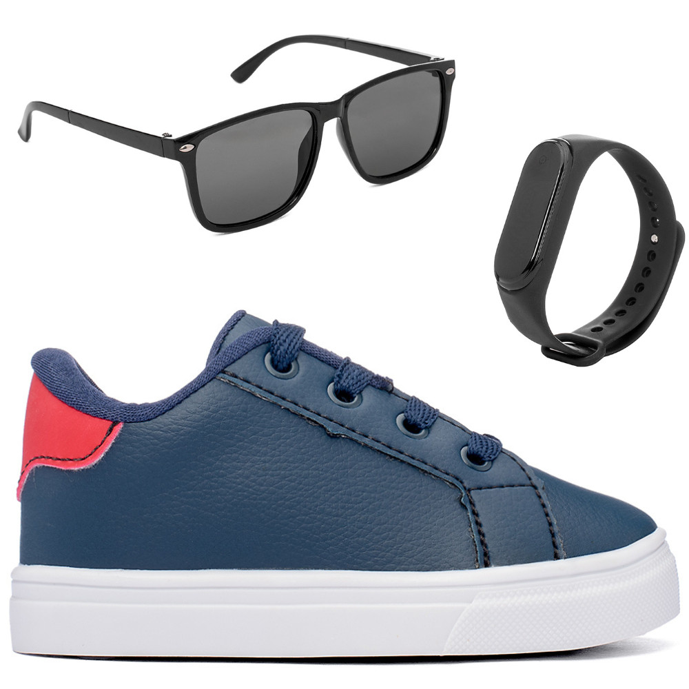 ***** AVISOS DA FUNFY ***** COMPONENTES DO KIT: 1 ÓCULOS DE COR SORTIDA DE ACORDO COM NOSSO ESTOQUE; 1 RELÓGIO DE COR SORTIDA DE ACORDO COM NOSSO ESTOQUE; 1 TÊNIS INFANTIL MASCULINO NA COR ESCOLHIDA. - EM CASO DE TROCA OU DEVOLUÇÃO, SÓ ACEITAMOS O KIT COMPLETO. NÃO É POSSÍVEL TROCAR OU DEVOLVER APENAS UM ITEM DO KIT. Kit Tênis Infantil mais oculos e relogio Um lindo KIT desenvolvido com cores alegres para deixar o dia do seu pequeno ainda mais especial. O solado de borracha proporciona segurança e conforto para os pezinhos, enquanto a palmilha em EVA garante maciez e absorção de impactos. O material sintético do cabedal é resistente e fácil de limpar. Com um design casual e leve, esse tênis é perfeito para o dia a dia dos meninos. Garanta já o conforto e alegria para os pés do seu principe! Embalado em uma prática caixa unitária para maior proteção do produto. A Funfy Kids é a loja ideal para você encontrar calçados infantis de alta qualidade. Especificações Detalhes Modelo Tênis Infantil Casual Material Externo Tecido Sintético Material Interno Têxtil Solado Borracha TR Antiderrapante Detalhes Recortes em Cores Fecho Cadarço Gênero Masculino Indicação Casual, Dia a Dia, Festas Características Leve, Confortável, Resistente Embalagem Caixa Ecológica Marca Funfy