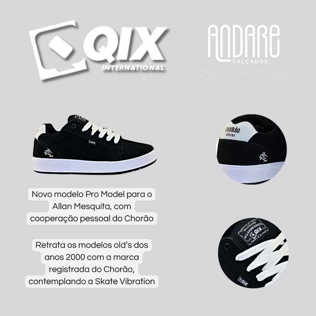FORMA: Normal (Ver tabela de medidas) CABEDAL: Camurça PALMILHA: EVA antibacteriano FECHAMENTO: Cadarço de amarrar SOLADO: Borracha de alta resistência com frisos antiderrapantes ENVIO: Na caixa do fabricante GARANTIA: Contra defeitos de fabricação - 30 dias O Tênis QIX Chorão Pro Model Allan Mesquita é a escolha perfeita para quem busca estilo, conforto e resistência em um só calçado. Com uma história que envolve a paixão pelo skate e a essência das ruas, este modelo exclusivo foi desenvolvido com a colaboração pessoal de Chorão e assinado por Allan Mesquita, entregando um visual autêntico e cheio de atitude. Ideal para skatistas e amantes da cultura urbana, o tênis reflete o espírito vibrante da Skate Vibration. Confeccionado em camurça natural de alta qualidade, o Pro Model Allan Mesquita garante durabilidade e sofisticação. O material resistente proporciona maior tempo de uso mesmo nas sessões de skate mais intensas, sem abrir mão da estética robusta e marcante. A atenção aos detalhes e o compromisso com a excelência fazem deste calçado um item essencial para quem busca resistência aliada ao design clássico. Inspirado nos modelos old school dos anos 2000, o Tênis QIX Chorão Pro Model apresenta um design robusto e minimalista. A marca registrada do Chorão está presente em elementos sutis, reforçando a identidade visual do modelo. O cabedal, com o logo da marca em destaque, adiciona um toque autêntico e estiloso, enquanto a referência à cultura do skate traz um ar nostálgico e contemporâneo ao mesmo tempo. O sistema de fechamento por cadarço proporciona ajuste firme e seguro, permitindo que o usuário tenha o controle total do encaixe. A lingueta em nylon, com espuma mais grossa, não só melhora o conforto como também garante uma melhor estabilização por meio dos elásticos internos. A etiqueta na parte interna da língua é mais um detalhe que agrega personalidade ao calçado. Além disso, o modelo acompanha duas opções de cores de cadarços. O conforto também é um dos grandes diferenciais do Pro Model Allan Mesquita. Seu interior é totalmente forrado e acolchoado, proporcionando uma sensação macia durante todo o uso. A espuma do colarinho mais grossa aumenta a proteção dos tornozelos, enquanto a palmilha anatômica em E.V.A. possui tratamento antibacteriano e antifúngico, prevenindo odores indesejados e promovendo maior higiene para o usuário. O modelo apresenta um solado de borracha de alta resistência, com costura dupla no estilo blaqueado, característica marcante da QIX. Essa tecnologia garante maior durabilidade e tração, oferecendo aderência impecável ao shape e ao chão. Para quem busca segurança e desempenho em manobras radicais, o Pro Model Allan Mesquita é a escolha certa. Seja para desbravar as pistas de skate ou para compor uma produção urbana cheia de personalidade, o Tênis QIX Chorão Pro Model Allan Mesquita é a fusão perfeita entre tradição e inovação. Celebre o legado de Chorão e sinta a vibração das ruas com um tênis feito para quem vive o skate em sua essência. TABELA DE MEDIDAS Tamanho 35 - 23.5cm Tamanho 36 - 24.4cm Tamanho 37 - 24.7cm Tamanho 38 - 25.6cm Tamanho 39 - 26.2cm Tamanho 40 - 27cm Tamanho 41 - 27.5cm Tamanho 42 - 28.1cm Tamanho 43 - 29cm Tamanho 44 - 29.6cm Tamanho 45 - 29.9cm