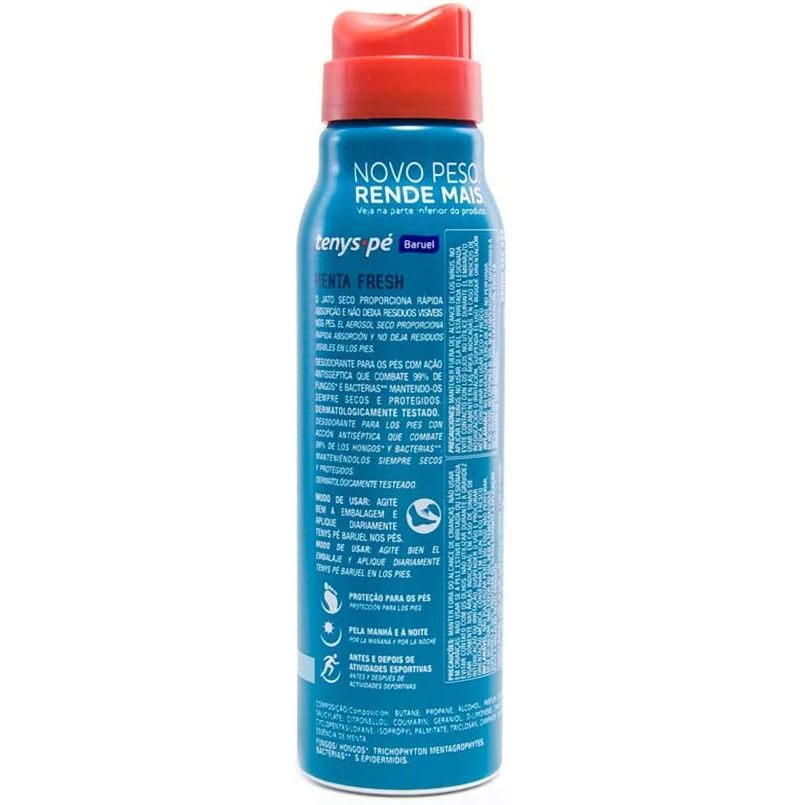 Tenys Pé Baruel Jato Seco Menta Fresh 92g Principais Características: • Fórmula com tecnologia Jato Seco que permite aplicação rápida e sem deixar resíduos. • Enriquecido com essência de menta, proporcionando sensação refrescante e revigorante. • Ação antisséptica eficaz para eliminar bactérias causadoras de odores. Benefícios: • Protege os pés contra o suor e o mau odor por longas horas. • Proporciona frescor intenso, ideal para dias quentes ou uso prolongado de calçados fechados. • Deixa os pés secos e confortáveis sem sensação pegajosa. Diferenciais do Produto: • Fragrância mentolada que oferece sensação refrescante imediata. • Pode ser aplicado também no interior dos calçados para maior proteção. • Produto dermatologicamente testado e de fácil aplicação. Especificações Técnicas: • Peso: 92g Instruções de Uso: Agite bem antes de usar. Aplique sobre os pés limpos e secos, mantendo a embalagem a cerca de 15 cm da pele. Também pode ser usado dentro dos calçados. Avisos e Precauções: • Uso externo. • Evitar contato com os olhos e mucosas. • Não aplicar em pele irritada ou lesionada. • Produto inflamável, manter longe de fogo ou superfícies aquecidas. • Manter fora do alcance de crianças. O que está incluso? 1 desodorante para os pés Tenys Pé Baruel Jato Seco Menta Fresh 92g ---- DÚVIDAS FREQUENTES ---- Os produtos são originais? Sim. Todos os nossos produtos são originais. Emitem nota fiscal? Sim. Emitimos nota fiscal para todos os pedidos.