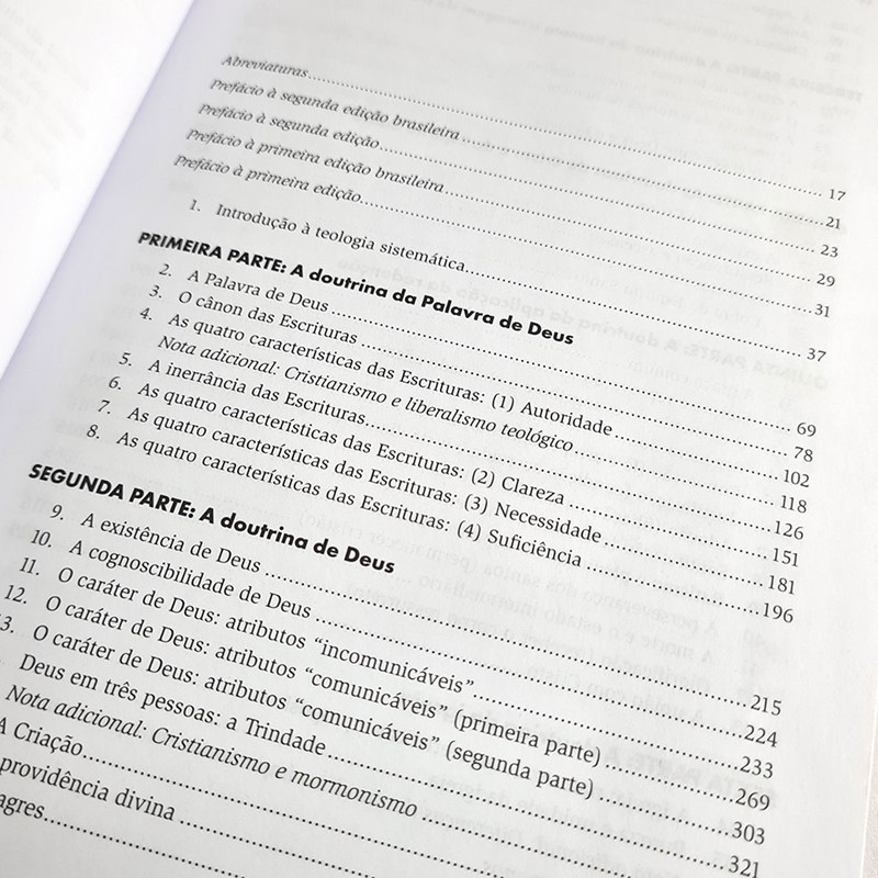 Páginas: 1.744 Altura: 25 cm Largura: 18 cm Profundidade: 8 cm Segunda edição revisada e ampliada Nesta nova edição, todos os 57 capítulos foram totalmente revisados e ampliados, sem perder as características que fizeram da obra o livro-texto em sua área: explicações claras, ênfase na base escriturística de cada doutrina e aplicações práticas para a vida diária. Com aproximadamente 250 páginas de conteúdo novo e revisões que levaram vários anos, esta nova edição ficou ainda melhor. Confira alguns aspectos distintivos: análise de diversas controvérsias recentes no mundo evangélico, incluindo o papel das mulheres na igreja, igrejas seeker-sensitive, dons miraculosos do Espírito Santo e a música de louvor contemporânea; novas e elaboradas críticas do teísmo aberto, da "nova perspectiva de Paulo", do molinismo (ou "conhecimento médio"), da teologia da "livre graça" e da posição preterista da segunda vinda de Cristo; um capítulo totalmente revisado sobre o tema criação e evolução, incluindo uma crítica mais ampla da evolução teísta; material adicional com explicações respeitosas sobre as diferenças entre protestantismo e o catolicismo romano; um louvor contemporâneo acrescentado ao final de cada capítulo, mantendo também os hinos tradicionais; nova análise da questão da impassibilidade de Deus; análise extensa da submissão eterna do Filho ao Pai, levando em consideração as controvérsias dos últimos anos.