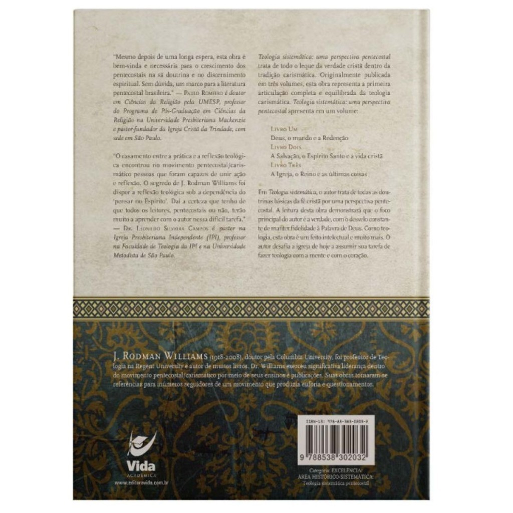 Esta Teologia Sistemática em perspectiva pentecostal trata de todo o leque da verdade cristã na tradição carismática. Em três volumes, representa a primeira articulação completa e equilibrada da teologia carismática. O casamento entre a prática e a reflexão teológica encontrou no movimento pentecostal-carismático pessoas que foram capazes de unir ação e reflexão. O segredo de J. Rodman Williams foi dispor a reflexão teológica sob a dependência do “pensar no Espírito”. Daí a certeza de que todos os leitores, pentecostais ou não, terão muito a aprender com o autor nessa difícil tarefa. Detalhes do Produto: Autor: J. Rodman Williams Editora: Vida Acabamento: Capa Dura Dimensões: 18 larg. X 24 alt. Número de páginas: 1211