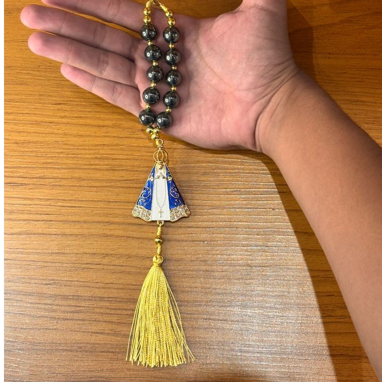 Terço Adorno Nossa Senhora Aparecida e São Bento para Carro ou Caminhão de Pedra Hematita