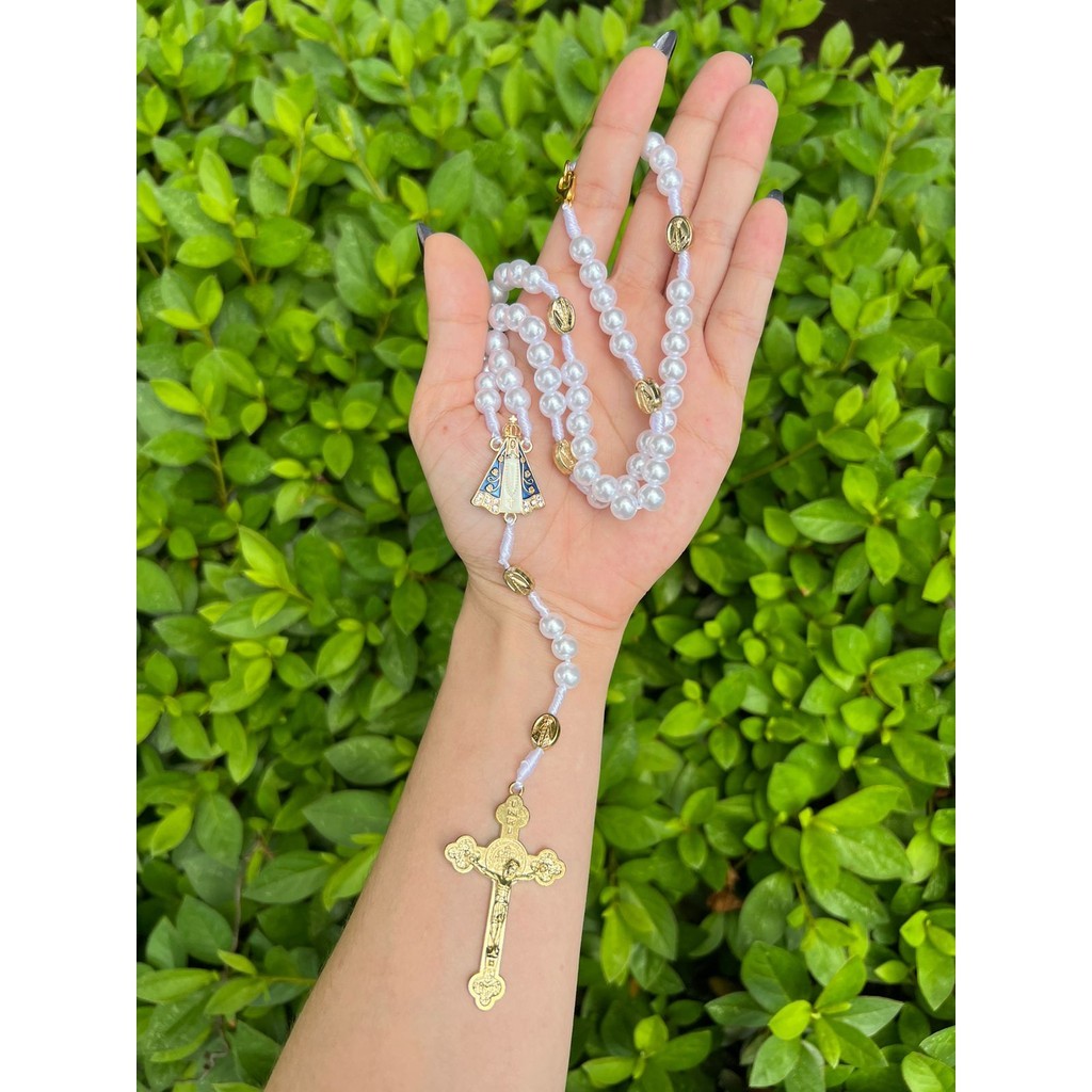 Terço Colar de Nossa Senhora Aparecida – Pérolas Brancas e Detalhes Dourados Lindo e delicado terço colar com pérolas brancas que simbolizam pureza e devoção. Este terço conta com: Passantes dourados nos Pai Nossos com imagens detalhadas; Cruz dourada com acabamento impecável; Medalha central de Nossa Senhora Aparecida, com detalhes coloridos em azul e dourado, que trazem ainda mais beleza à peça; Fecho dourado, prático e seguro, que permite usá-lo com facilidade no pescoço. Com 40 cm de comprimento, este terço é ideal para expressar sua fé com elegância e sofisticação. Um presente perfeito ou um item especial para momentos de oração e proteção.