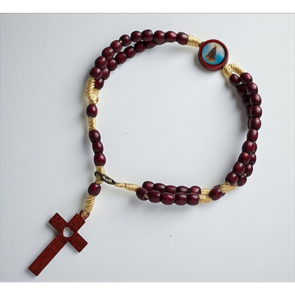 Terço de pulso com contas delicadas e medalha de Nossa Senhora Aparecida, destacando um coração na cruz como símbolo de fé e amor divino. Compacto e elegante, é perfeito para levar proteção, devoção e bênçãos consigo em todos os momentos do dia.