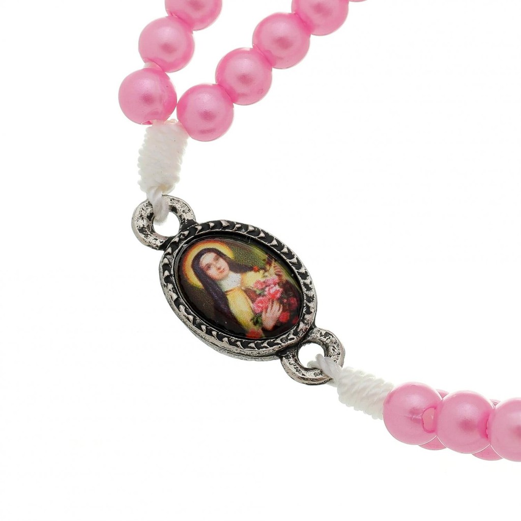 Terço de pulso Santa Terezinha do Menino Jesus Terço de pulso com conta e entremeio em pérola metalizada na cor rosa claro, medalha em metal prata e imagem colorida em resina de Santa Terezinha, crucifixo na cor prata velha, fecho de metal e barbante na cor branca. Especificações: Conta: 5mm de diâmetro Medalha: 1,2cm altura x 1cm largura Crucifixo: 2,2cm altura x 1,4cm largura Comprimento da peça: 25cm ***Medidas aproximadas***
