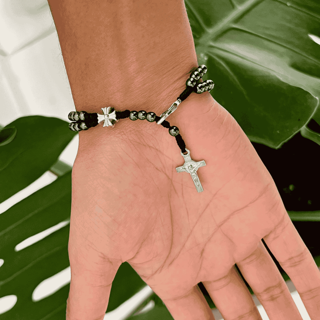 Terço de Pulso São Bento em Pedra de Hematita Unissex Uso Diário Alta Qualidade
