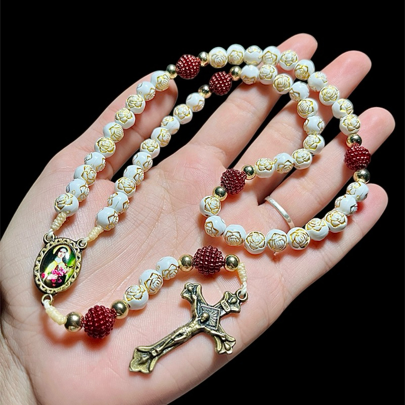 Terço de Santa Terezinha 🤍 Delicado como sua fé e puro como as rosas brancas que simbolizam suas promessas de amor e simplicidade. Um convite à confiança em Deus e à prática do amor nas pequenas coisas do dia a dia. Medalha resinada e cruz em metal bronze. Tamanho: aprox. 30cm Obs: esse modelo não é para ser usado no pescoço.
