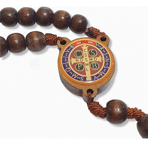 Terço de pescoço em madeira da Medalha do São Bento, com a medalha colorida em resina importada. Ideal para ser usado no pescoço ou para reza de mão. Perfeito para presentear alguém querido ou para uso próprio.