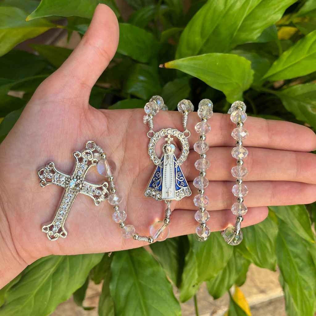 Terço Noiva Nossa Senhora Aparecida Cristal Transparente com detalhe Prata