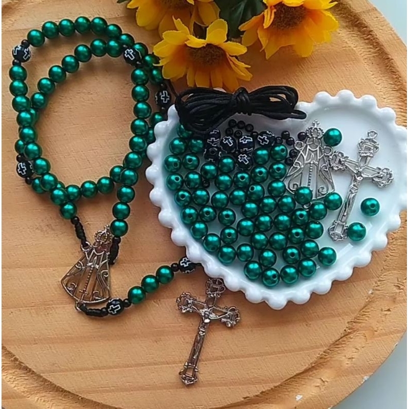 aprenda a fazer terços kit para montagem 53 miçangas de 8mm para as ave Marias 6 pedras craqueladas de 10mm para pai nossos 16 bolinhas de 4 mm para usar entre as miçangas 1,5 metro de fio Encerado ou 1,5 metro fio de cetim vai depender da cor 1 crucifixo altura:5.0 cm largura:2.9cm. 1 lindo entremeio de Nossa Senhora Aparecida em metal zamac ( entremeio vazado). altura:4,3cm largura: 2,2cm. kit Cristal 60 unidades de bolinhas de 8mm 14 unidades de bolinhas de 4 mm 1,50 metro de cordão encerrado 1 crucifixo 1 entremeio ATENÇÃO leia atentamente o anúncio qualquer dúvida me chama no chat.