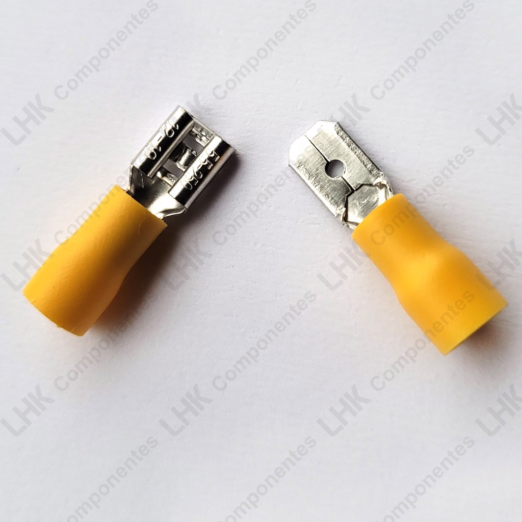 ATENÇÃO: Este terminal possui tamanho único, que serve tanto para cabos de bitola 0,5mm2 quanto para cabos de bitola 1,5mm2. Cores e Quantidade a selecionar nas variações O cabo deve ser crimpado no terminal com uso de ferramenta apropriada para crimpar. Possibilita uma conexão elétrica com maior praticidade e segurança. Desconectável de forma prática. Especificações: Para utilização com cabos flexíveis de 0.5 mm2 a 1.5mm2 (22 - 16 AWG) Medidas apresentadas nas fotos do produto. Material do terminal - latão Material do isolante - PVC retardante de chamas Cor do isolante: Disponível em várias cores, a selecionar nas variações FDD1.25-250 Fêmea tipo pré-isolado MDD1.25-250 Macho tipo pré-isolado