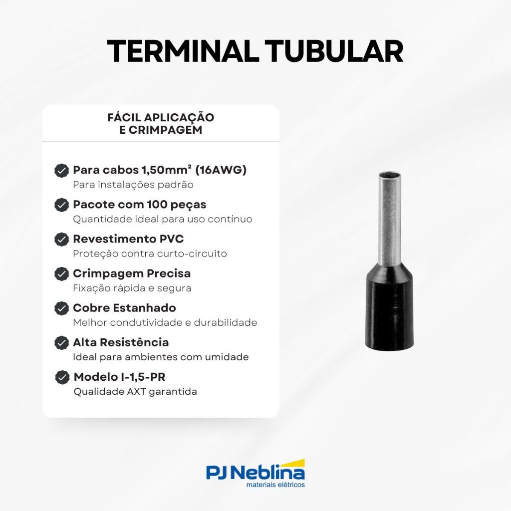 Terminal Tubular (Ilhós) 1,50Mm (16Awg) Pré-Isolado Preto Cobre Estanhado Axt CARACTERÍSTICAS: • Embalagem com 100 unidades, ideal para uso profissional e manutenção em série. • Terminal tubular (ilhós) com seção de 1,50 mm² (16 AWG), ideal para conexões confiáveis. • Fabricado em cobre estanhado, proporcionando excelente condutividade e resistência à corrosão. • Isolamento plástico na cor preta para facilitar a identificação e organização. • Garante crimpagem segura e acabamento profissional em instalações elétricas. • Aplicação prática com ferramentas de pressão. • Indicado para melhorar o contato elétrico e evitar desgaste dos fios. • Produto Axt, referência em qualidade e durabilidade. APLICAÇÃO: • Utilizado na terminação de cabos em bornes, painéis e dispositivos elétricos. • Ideal para instalações industriais, comerciais e residenciais. • Recomendado para organização e segurança em sistemas de automação e controle. ESPECIFICAÇÕES TÉCNICAS: Marca: Axt Referencia: I-1,5-PR Produto: Terminal Elétrico Tipo: Tubular (Ilhós) Seção Cabo: 1,50mm (16awg) Isolação: Pré-Isolado Cor Isolação: Preto Corpo: Duplo Material: Cobre Estanhado Material do isolante: PP Temperatura máxima: 105° C Embalagem: 100 unidades Após o período de garantia da loja de 30 dias, a tratativa de garantia deverá ser diretamente com o fabricante. Garantia do Fornecedor: 30 Dias.