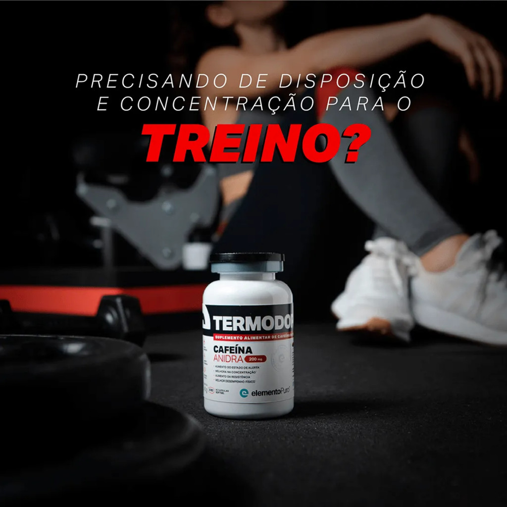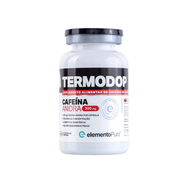 INFORMAÇÕES DE DESTAQUE Suplemento alimentar em cápsulas; 200mg de Cafeína Anidra; Cápsulas de softgel; Rápida absorção. DESCRIÇÃO TERMODOP é um suplemento alimentar de cafeína em cápsulas, ideal para dar aquele gás necessário para maximizar os rendimentos. Proporciona mais foco e energia para o dia a dia, com todas as vantagens da cafeína anidra e a qualidade oferecida pela elementoPuro. Seja no trabalho, nos estudos ou nos treinos, TERMODOP proporciona a disposição para você ir além. São tantas vantagens que nem dá para acreditar que cabe tudo em uma só cápsula. Experimente e comprove! TERMODOP - Disposição para você ir além. COMPOSIÇÃO Óleo de soja, cafeína anidra, emulsificante lecitina de soja e cápsula (gelatina, água purificada, umectante glicerina, corante vermelho pnceau, azul brilhante, amarelo crepúsculo e dióxido de titânio). SUGESTÃO DE USO Recomenda-se a ingestão de 1 (uma) cápsula, 1 (uma) vez ao dia, ou conforme orientação de um profissional de saúde. Consumir preferencialmente 1 (uma) hora antes da atividade física. Recomenda-se o consumo para indivíduos maiores de 19 anos.