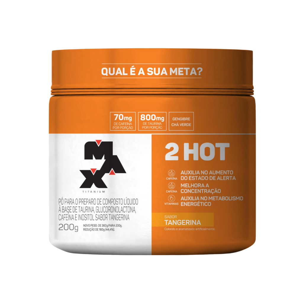 COMPOSIÇÃO DO ANÚNCIO: 1x 2HOT - 200 - MAX TITANIUM DESCRIÇÃO DO ANÚNCIO: 2HOT possui, dentre seus ingredientes, taurina e a cafeína, que auxilia no aumento do estado de alerta e na melhora da concentração. Além disso, conta com alto teor de vitaminas que auxiliam no metabolismo energético contribuindo para o bem-estar e no fornecimento de energia. Benefícios: -Ação rápida; -Alto teor de vitaminas Auxilia no metabolismo energético; -70mg de cafeína por porção Auxilia no aumento do estado de alerta e melhora da concentração; -800mg de taurina por porção; -Pimenta vermelha; -Gengibre; -Chá verde. Modo de Preparo: Misturar 6g (1 dosador raso) de 2HOT em 200mL (1 copo) de água gelada e agitar com a ajuda de uma colher até completa dissolução. Beber imediatamente Sugestão de uso: Ingerir uma porção pela manhã e outra antes do almoço ou conforme orientação de nutricionista ou médico.