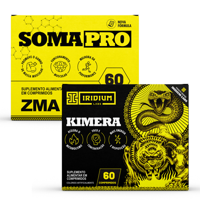 Kimera Termogênico Iridium Labs - 60 comps Eleito duas vezes como "o Melhor Termogênico do Brasil" , Kimera acelera o metabolismo e melhorar a performance nos treinos. Diferenciais: 300mg de cafeína por dose. A cafeína tem ação cientificamente comprovada no aumento do gasto energético, no aumento do estado de alerta e da energia e da disposição física e mental. Contém aromatizantes naturais extrato de chá verde, citrus aurantium e gengibre, que também têm ação de aceleração do metabolismo. Benefícios: Dá mais energia e disposição para treinar Promove a melhora da performance atlética aceleração do metabolismo. Informações Técnicas: Apresentação: comprimidos Cada caixa contém 60 comprimidos Duração de cada caixa: 30 dias Não contém glúten Modo de consumo: Consumir duas cápsulas ao dia, cerca de 40 minutos antes da atividade física, ou conforme orientação de médico ou nutricionista." Soma Pro ZMA Pré Hormonal - 60 comps Iridium Labs ZMA, ou aspartato de zinco e magnésio, é um suplemento popular. Ele contém uma combinação de três ingredientes principais - zinco, magnésio, vitamina B6 e, no caso do SomaPro além desses três nutrientes fundamentais contém também Selênio.A deficiência de qualquer um desses minerais pode trazer prejuizos a saúde. * ESTE PRODUTO NÃO É UM MEDICAMENTO. Suplemento esportivo Esse tipo de suplemento ajuda a complementar a alimentação de pessoas com objetivos ou requisitos nutricionais específicos. Seu consumo pode ser indicado por vários fatores, como a duração e a intensidade da atividade física, o tipo de esporte, o ambiente em que é praticado, a idade, a composição corporal, o peso, etc. É importante destacar que seu uso deve ser acompanhado por uma alimentação equilibrada e hábitos de vida saudáveis. *Este produto é um suplemento dietético, não é um medicamento. Suplementa Ante dietas insuficientes. Consulte seu médico e / ou farmacêutico. O zinco auxilia na visão O zinco contribui para a manutenção do cabelo, da pele e das unhas. O zinco auxilia no metabolismo de proteínas, carboidratos e gorduras. O zinco auxilia na síntese de proteínas O zinco auxilia na manutenção de ossos. O zinco auxilia no funcionamento do sistema imune O selênio é um antioxidante que auxilia na proteção dos danos causados pelos radicais livres. O selênio auxilia no funcionamento do sistema imune. A vitamina B6 auxilia na formação das células vermelhas do sangue A vitamina B6 auxilia no funcionamento do sistema imune. A vitamina B6 auxilia no metabolismo energético. A vitamina B6 auxilia no metabolismo de proteínas e do glicogênio. A vitamina B6 auxilia no metabolismo de proteínas, carboidratos e gorduras. A vitamina B6 auxilia na síntese de cisteína. A niacina contribui para a manutenção da pele. A niacina auxilia na manutenção de mucosas. A niacina auxilia no metabolismo energético. A niacina auxilia no metabolismo de proteínas, carboidratos e gorduras. O magnésio auxilia na formação de ossos e dentes. O magnésio auxilia no metabolismo energético. O magnésio auxilia no metabolismo de proteínas, carboidratos e gorduras O magnésio auxilia no equilíbrio dos eletrólitos. O magnésio auxilia no funcionamento neuromuscular. O magnésio auxilia no processo de divisão celular. Requisitos: As alegações são restritas aos suplementos alimentares cuja quantidade de magnésio atenda aos valores mínimos estabelecidos na IN 28/2018 e suas atualizações. Fonte de magnésio. Requisitos: As alegações são restritas aos suplementos alimentares cuja quantidade de magnésio atenda aos valores mínimos estabelecidos na IN 28/2018 e suas atualizações. Alto conteúdo/Rico em/Alto teor de magnésio. Requisitos: A alegação é restrita aos suplementos alimentares cuja quantidade de magnésio corresponda ao dobro dos valores mínimos estabelecidos na IN 28/2018 e suas atualizações, desde que não ultrapasse o limite máximo estabelecido na IN 28/2018 e suas atualizações. Ingredientes: Óxido de Magnésio, Carbonato de Cálcio, Óxido de Zinco, Piridoxina HCL, Nicotinamida, Selenito de Sódio, Agente de massa: Celulose Microcristalina; Estabilizante; Croscamerlose Sódica; Antiumectante: Dióxido de Slício: Lubrificante: Esteorato de Magnésio: Espessantes: Copolímero Enxertado de Álcool Polivinilico. Talco, Polietilenoglicol; Corante: Óxido de Ferro Preto INS172i.