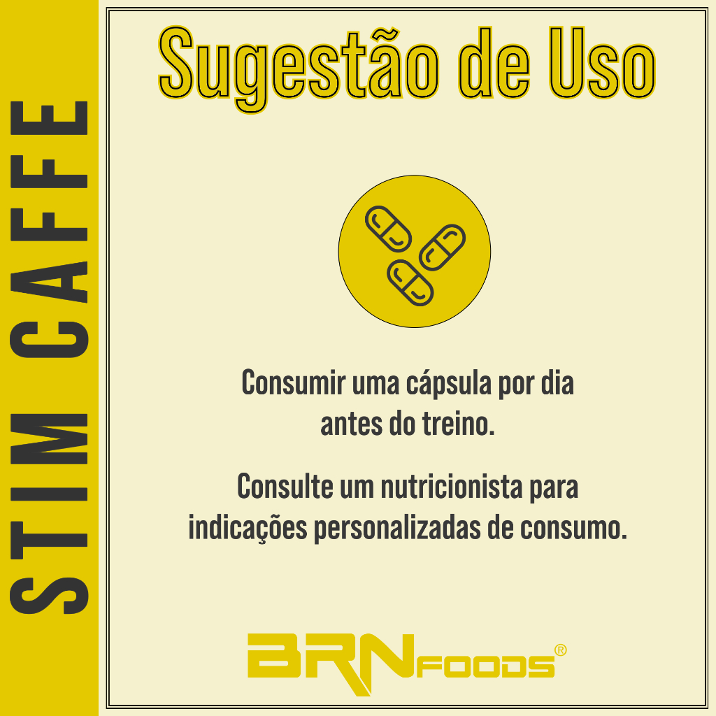 STIM CAFFE – BRN FOODS O STIM CAFFE da BRN FOODS é um suplemento alimentar em cápsulas, com 420mg de cafeína por dose, indicado para quem busca praticidade na rotina de suplementação. Cada embalagem contém 60 cápsulas. Sugestão de uso: Consumir 1 cápsula ao dia, preferencialmente antes da atividade física ou conforme orientação profissional. Ingredientes: Cafeína anidra, gelificante e água purificada. Apresentação: 60 cápsulas – Peso líquido 30g. Recomendações: Este produto não é um medicamento. Não exceder a recomendação diária de consumo indicada na embalagem. Consulte um profissional de saúde antes de utilizar. Conservação: Conservar ao abrigo da luz, calor e umidade. Após aberto, manter a embalagem bem fechada.