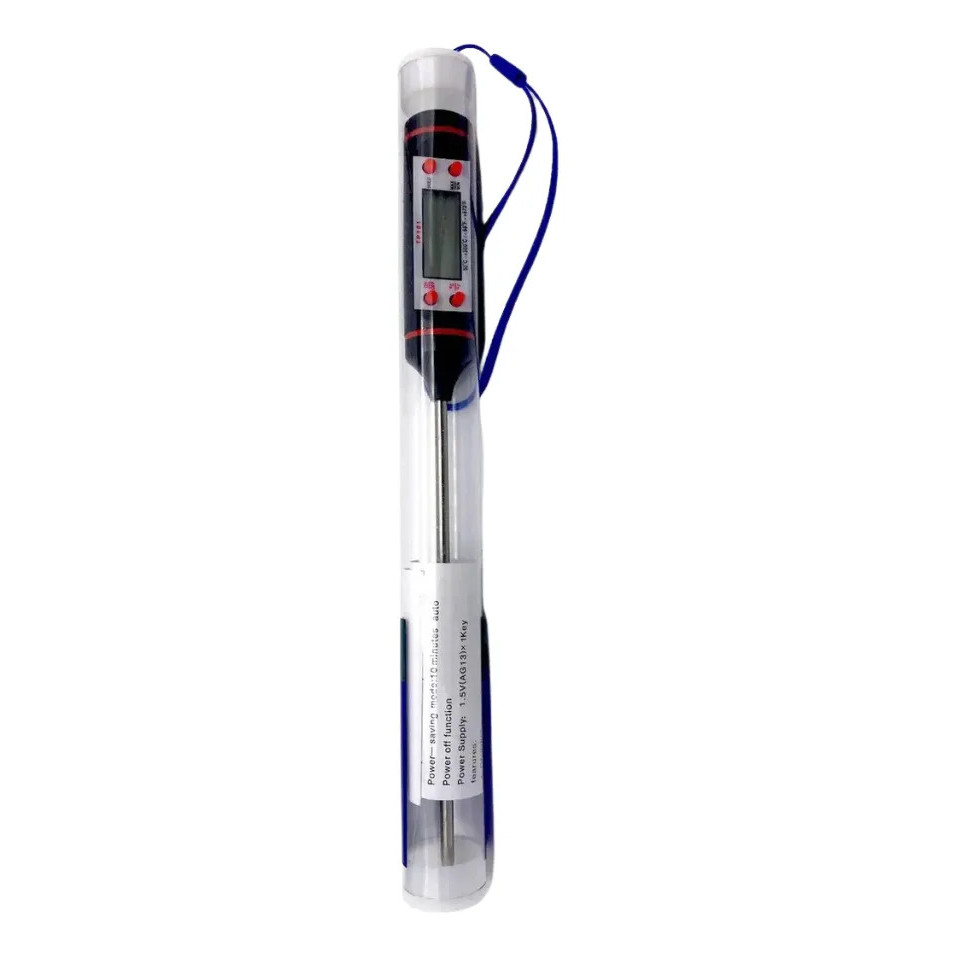 Este termômetro digital de alimentos é prático, preciso e fácil de usar. Possui sonda de aço inoxidável que permite medir rapidamente a temperatura de diferentes tipos de alimentos e líquidos. É ideal para uso na cozinha, churrasco, preparo de bebidas, leite, óleo e diversos outros alimentos. Também pode ser utilizado em ambientes domésticos, atividades ao ar livre e aplicações experimentais. O design em formato de caneta facilita o transporte e o armazenamento. O visor LCD permite uma leitura clara da temperatura, enquanto o sistema de medição possui ampla faixa de temperatura e boa estabilidade. Faixa de Medição de Temperatura -50°C a 300°C (-58°F a 572°F) Precisão ±1°C (-20°C a 80°C) ±2°C (outras faixas) Resolução 0,1°C Funções Liga / Desliga Conversão entre Celsius (°C) e Fahrenheit (°F) Função HOLD para travar a temperatura medida Memória de temperatura máxima e mínima (MAX / MIN) Economia de Energia Desligamento automático após 10 minutos sem uso. Aplicações Pode ser usado para medir temperatura de água, alimentos, líquidos, óleo, leite, chá, sopa, cerveja e outros. Adequado para cozinha doméstica, churrasco, atividades ao ar livre, escola e uso industrial. Especificações Comprimento total: 225 mm Comprimento da sonda: 145 mm Tamanho do visor: 28 mm × 12 mm Alimentação 1 bateria botão LR44 Conteúdo da Embalagem 1 Termômetro digital 1 Bateria 1 Manual de instruções