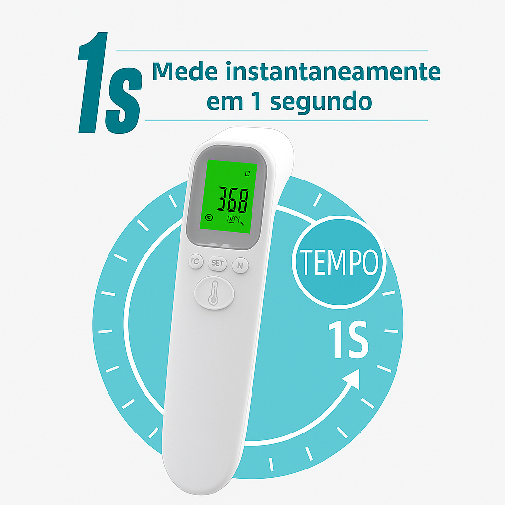 ENVIO IMEDIATO Termômetro Infravermelho Digital Sem Contato AD802 Clínico Profissional Médico Hospitalar Alta Precisão Medição Rápida 1 Segundo Descrição Termômetro infravermelho digital sem contato modelo AD802, ideal para uso clínico, profissional e doméstico. Indicado para hospitais, consultórios, empresas, escolas e residências. Mede a temperatura corporal de forma rápida e precisa em apenas 1 segundo, sem necessidade de contato físico, evitando risco de contaminação. Também pode ser usado para medir a temperatura de objetos, superfícies, alimentos e líquidos. Benefícios e vantagens Medição rápida em 1 segundo Tecnologia infravermelho de alta precisão com margem de erro de apenas mais ou menos 0.2 C na faixa ideal Uso sem contato de 3 a 5 cm de distância Indicação visual de temperatura com luz de fundo: verde para normal, laranja para febre baixa e vermelho para febre alta Memória para 32 medições anteriores Alternância entre Celsius e Fahrenheit Desligamento automático para economia de bateria Leve, portátil e fácil de usar Especificações técnicas Modelo AD802 Tipo termômetro infravermelho sem contato Faixa de medição de 34.0 C a 42.6 C Precisão de mais ou menos 0.2 C entre 35.0 C e 42.0 C e mais ou menos 0.3 C fora dessa faixa Distância de uso de 3 cm a 5 cm Alimentação com 2 pilhas AAA não inclusas Peso de 64 g Armazenamento entre menos 20 C e mais 55 C, umidade menor ou igual a 93 por cento RH Dimensões de 40 mm x 40 mm x 150 mm Perguntas frequentes Pode ser usado em bebês e crianças? Sim, é seguro para todas as idades, ideal para medir temperatura de bebês e crianças sem contato físico. Funciona para medir temperatura de objetos? Sim, mede superfícies, líquidos, alimentos e outros objetos além da temperatura corporal. É confiável? Sim, possui alta precisão e é utilizado por profissionais da saúde e usuários domésticos. Tem garantia? Sim, garantia contra defeitos de fabricação. Posso escolher a leitura em Celsius ou Fahrenheit? Sim, é possível alternar entre C e F. Por que escolher este termômetro? O termômetro infravermelho digital sem contato AD802 oferece rapidez, precisão e praticidade. É um equipamento versátil e seguro, ideal para monitoramento de saúde em residências, clínicas, hospitais, empresas e escolas.