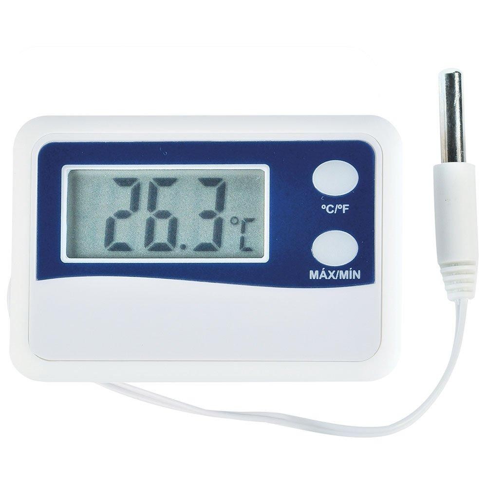 Termômetro Digital à prova d'água com temperatura externa através de cabo e sensor, registro de temperatura máxima e mínima, temperatura °C/°F selecionável e imã de fixação em objetos metálicos. É utilizado para controle de temperatura de caixas térmicas, geladeiras e transporte de vacinas. - Especificações Técnicas: :: Faixa de medição: -50°C + 70°C/°F :: Resolução: 0,1°C/°F :: Precisão: ±1°C na faixa de -20°C + 50°C ±2 no restante da escala :: Temperatura de operação: 0°C à 50°C :: Pilha: 1x 1,5V tipo AAA :: Comprimento do cabo: Aprox. 50cm :: Dimensões: 60 x 39 x 14mm :: Peso: 41g - Conteúdo da embalagem: :: 1 Termômetro Digital - Garantia: 6 meses - 7898360221554 Ref.: INCOTERM-742402100 Marca.: INCOTERM
