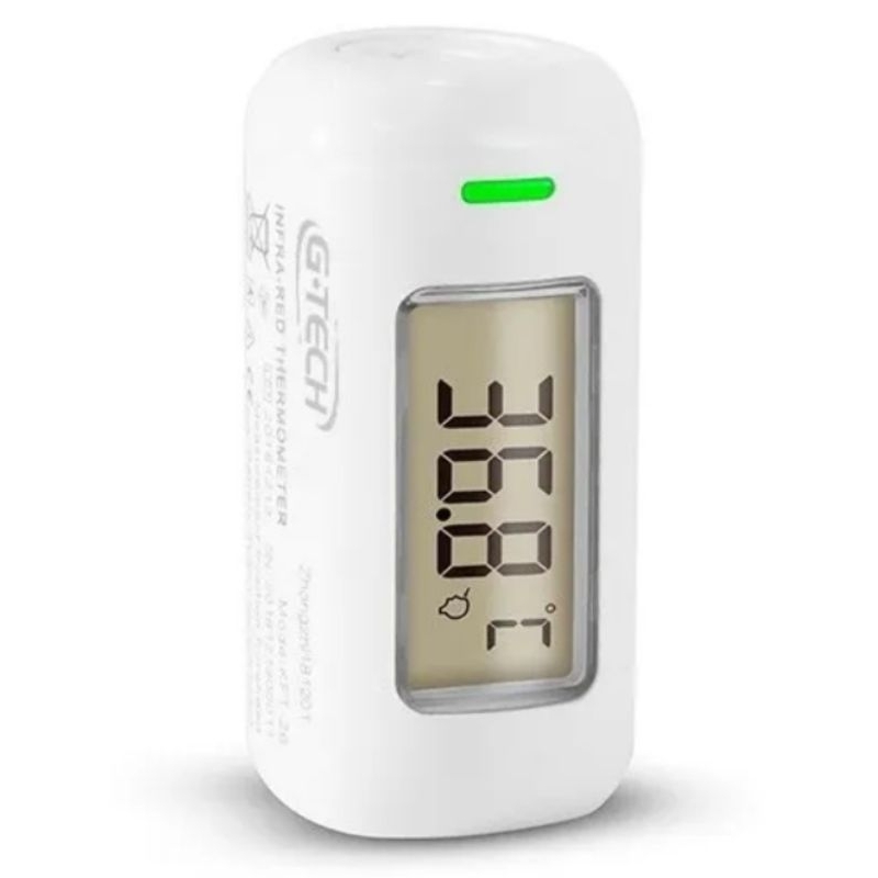 Ultra compacto e leve, cabe na palma da mão, com 4,8cm e 22g; Com três alarmes de cor, azul para temperaturas inferiores a 35,5°C, verde para temperaturas entre 35,5°C e 37,5°C e vermelho para temperaturas superiores a 37,5°C; Resultado da Temperatura em 1 segundo; Para verificar a temperatura deve-se encostar o termômetro na testa, com o visor para frente; Medição automática ao fazer contato com a pele; Memória para 20 medições, que permite acompanhamento a longo prazo; Modelo infravermelho; A opção ideal para levar a qualquer lugar. Possui 3 tipos de cor de luz de LED (alarme de febre) 35,5°C (95,5°F) ou menos Azul 35,5°C - 37,5°C (95,5°F - 99,5°F) Verde Mais que 37,5°C (99,5°F) Vermelho Itens Inclusos 01 Termômetro Digital Infravermelho G-TECH Go; 01 manual de instruções 01 mini chave de fenda; 01 bateria 3V tipo CR2032. Visão Geral ESPECIFICAÇÕES TÉCNICAS Faixa de temperatura de Medição 32 °C - 42.9 °C / 89.6 °F - 109.2°F Precisão 35°C - 42°C: ± 0,2°C; 95°F -107,6 °F: ± 0,4°F 32°C - 34,9°C: ± 0,3°C; 89,6°F - 94,8°F: ± 0,5°F 42,1°C - 42,9°C: ± 0,3°C; 107,8°F -109,2° F: ± 0,5 °F Resolução 0.1°C Fonte de alimentação 01 (uma) bateria 3V tipo CR2032; Resultados do teste expressos em Grau Celsius (°C) e em graus Farenheit (°F); Temperatura de armazenamento / transporte - 25° a + 55°C; Umidade de Armazenamento e Transporte 10% a 90% UR Pressão atmosférica de Armazenamento e Transporte 70kPa a 106 kPa Temperatura de operação + 15° a + 35°C; Umidade de operação 15% a 85% UR Pressão atmosférica de operação 70kPa a 106 kPa Dimensões do termômetro 47.5 mm (C) x 23.5 mm (L) x 25 mm (A) Dimensões do display LCD 26 mm x 13 mm Peso 22 g (incluindo a bateria) Capacidade de Memória 20 resultados Desligamento automático Após 30 segundos em descanso