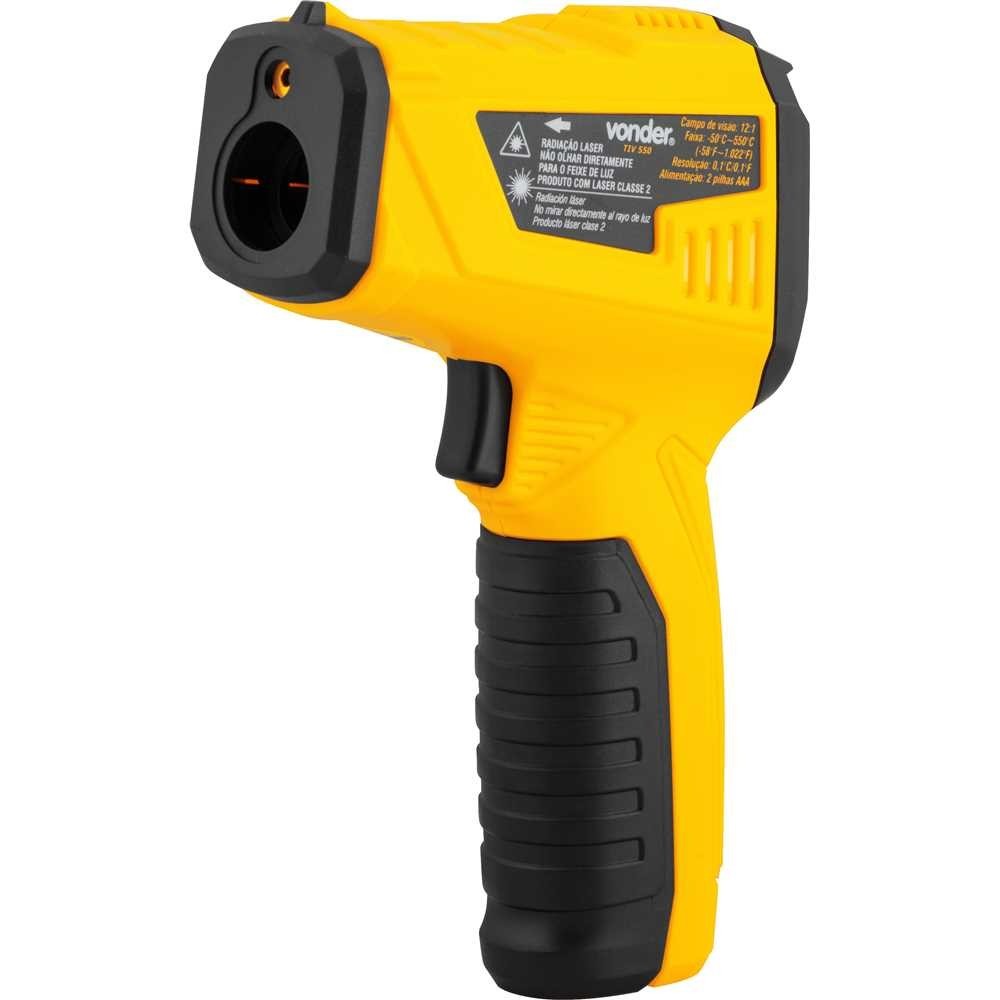 Termômetro infravermelho, TIV 550 VONDER Possui visor de cristal líquido com ou sem opção de iluminação, desligamento automático após 30 segundos de inatividade, indicador de bateria fraca e funções de ajuste de alerta para temperatura máxima e temperatura mínima, através de LED indicador. Conta também com mira laser, que auxilia o trabalho deixando a medição mais precisa. Possui ajuste de emissividade, que permite melhor precisão na medição conforme o tipo de material. Indicado para medições de temperatura em geral, sem necessidade de encostar o termômetro no local ou no equipamento a ser medido. Utilizado para medições de temperatura de superfícies, permitindo rápida localização de problemas (ausência de lubrificação, sobrecarga, curto-circuito, equipamentos com problemas de alinhamento ou aquecimento excessivo em máquinas, motores, equipamentos eletrônicos, caixas de distribuição elétrica, entre outros) reduzindo o tempo de diagnóstico e trabalho. Quanto maior a distância do objeto em relação ao termômetro, maior será o diâmetro de abertura do termômetro infravermelho. O medidor possui uma resolução óptica (razão entre a distância e o diâmetro) de 12:1, ou seja, para 500 mm de distância o diâmetro de medição é de 42 mm. Para um resultado satisfatório, o objeto a ser medido deve ser pelo menos de 1,5 a 2 vezes maior que a amplitude do campo de medição. Não indicado para medição de temperatura corporal. Modelo: TIV 550 Classe do marcador laser do termômetro digital: Classe 2 Número de dígitos no display do termômetro digital: 4 dígitos Campo de visão: 12:1 Sistema de medida: Infravermelho Faixas de medição (infravermelho): -50°C ~ 550°C Conversão de unidades: °C / °F Resolução do termômetro digital: 0,1°C / 0,1°F Precisão: - 50°C ~ 0°C: ±3°C; 0°C ~ 550°C: ±1,5% + 2°C Tempo de resposta: < 500 ms Repetibilidade: ±0,5% ~ ±1°C Emissividade: Ajustável entre 0,10 ~ 1,00 Função (máxima/mínima): Máxima Iluminação de fundo: Sim Auto desligamento: Sim, após 30 segundos de inatividade Temperatura ideal do ambiente de trabalho: 0ºC ~ 40ºC Umidade relativa do ar ideal para trabalho: 10% - 95% Dimensões: 90 mm x 45 mm x 145 mm Alimentação: 2 Pilhas (AAA - alcalinas) Massa aproximada (peso) (kg): 0,135 kg Conteúdo da Embalagem: 1 Termômetro infravermelho. Acompanha: 2 pilhas (AAA alcalina).