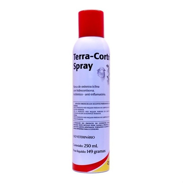 Composição: Cada 100 mL contém 6,8 g de Terramicina® (cloridrato de oxitetraciclina) e 2,0 g de hidrocortisona. Indicações: Tratamento de queratoconjuntivite infecciosa (pink eye) de bovinos e ovinos, nas afecções oculares e cutâneas, eczemas, queimaduras, ferimentos acidentais ou cirúrgicos, fístulas e supurações em geral. Posologia e modo de usar: Retirar a tampa do tubo. Agitar antes de usar. Dirigir o orifício da válvula para o local a ser tratado e manter o tubo a 10 cm de distância. Medicar toda a área lesada. Repetir o tratamento tanto quanto necessário. Período de carência e precauções: - Produto inflamável. - Não fure nem incinere o tubo, mesmo vazio. - Mantenha fora do alcance de crianças e animais domésticos. - Não use ou guarde em lugar quente, próximo a chamas ou exposto ao sol. Apresentação: Tubo com 250 mL (149 g). Tratamento de querato-conjuntivite infecciosa (pink eye) de ovinos, afecções oculares e cutâneas, eczemas, queimaduras, ferimentos acidentais ou cirúrgicos, fístulas e supurações em geral. Antibiótico e anti-inflamatório.