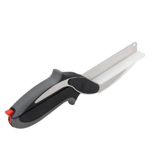 Tesoura 2 Em 1 Produto de alta qualidade. 2-em-1, faca e tábua de corte. Fatias em segundos. Cabo ergonômico. Lâmina de aço inoxidável Premium. Economize espaço no balcão. Trava de segurança para mantê-lo fechado, Lavável.