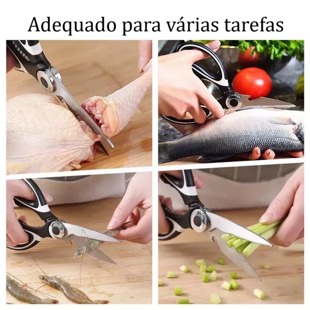 Tesoura Multiuso de Cozinha 5 em 1 — prática, resistente e indispensável no seu dia a dia culinário! Fabricada com lâminas de aço inoxidável de alta durabilidade, essa tesoura foi projetada para realizar diversas funções em um único utensílio, oferecendo mais praticidade e eficiência na cozinha. Funções do produto: Corta legumes, frutas e ervas com facilidade e precisão. Ideal para cortar frango, pato, peixes, ossos leves, camarões e outras carnes, substituindo a faca em várias tarefas. Raspador de escamas integrado para limpeza rápida de peixes. Abre-garrafas embutido, facilitando a abertura de tampas metálicas. Quebra-nozes e outras castanhas, graças à área serrilhada entre os cabos. Características: Lâminas afiadas em aço inoxidável. Cabo ergonômico antiderrapante para maior conforto e segurança. Design multifuncional que economiza espaço e torna a cozinha mais prática. Fácil de limpar e resistente ao uso diário. Perfeita para quem busca um utensílio versátil, moderno e eficiente. Uma única ferramenta para diversas tarefas! ---------------------- Tesoura Multiuso de Cozinha 5 em 1 — prática, resistente e indispensável no seu dia a dia culinário! Fabricada com lâminas de aço inoxidável de alta durabilidade, essa tesoura foi projetada para realizar diversas funções em um único utensílio, oferecendo mais praticidade e eficiência na cozinha. Funções do produto: ✂️ Corta legumes, frutas e ervas com facilidade e precisão. 🍗 Ideal para cortar frango, pato, peixes, ossos leves, camarões e outras carnes, substituindo a faca em várias tarefas. 🐟 Raspador de escamas integrado para limpeza rápida de peixes. 🍾 Abre-garrafas embutido, facilitando a abertura de tampas metálicas. 🌰 Quebra-nozes e outras castanhas, graças à área serrilhada entre os cabos. Características: Lâminas afiadas em aço inoxidável. Cabo ergonômico antiderrapante para maior conforto e segurança. Design multifuncional que economiza espaço e torna a cozinha mais prática. Fácil de limpar e resistente ao uso diário. Perfeita para quem busca um utensílio versátil, moderno e eficiente. Uma única ferramenta para diversas tarefas!