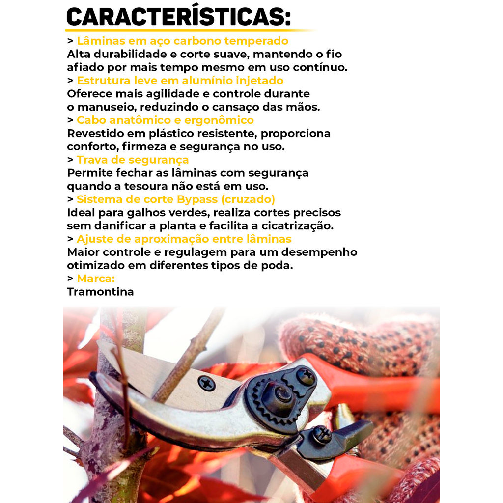 Tesoura De Poda Tramontina Lâmina De Aço Metálica Cabo Ergonômico P/ Jardinagem Arbustos Flores