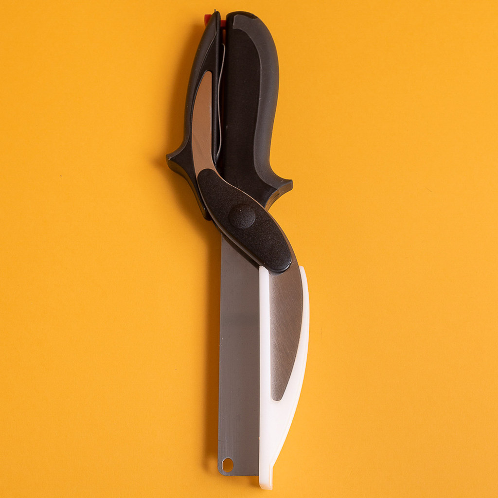Essa é a tesoura fatiadora da MOZCADA. Prática: corta com rapidez e sem esforço. 2 em 1: ela é tesoura e tábua de corte. você pode cortar, fatiar e picar os alimentos direto na panela, tigela ou prato. Segura e fácil de guardar: ela tem uma trava de segurança para guardá-la bem fechadinha, sem o perigo de se cortar.