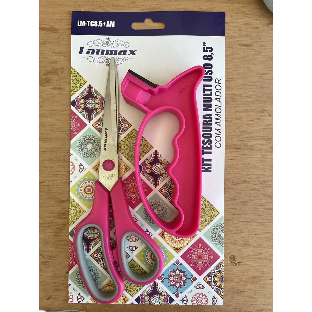 Tesoura lanmax de 8,5 polegadas com 22 cm e cabo emborrachado em formato anatômico. Muito confortável e precisa para cortes em tecidos, papéis e outros serviços gerais acompanha amolador que pode ser usado em tesouras e facas, muito útil para sua casa ou trabalho. kit contém 1 tesoura lanmax 8,5 polegadas 1 amolador de tesoura e faca