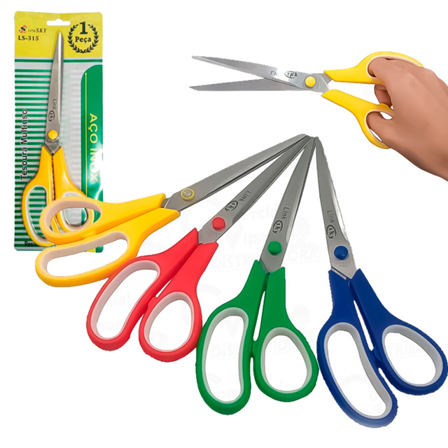 COMERCIAL VIPASA DISTRIBUIDORA. TESOURA ESCOLAR TRABALHOS ARTESANATO COSTURA E MUITO MAIS Tesoura Multiuso Inox 9,5Pol. Pontas Redondas Inoxidável Cozinha Costura Uso Geral Cores Sortidas Tesoura Multiuso Inox 9Pol. Pontas Redondas Inoxidável Cozinha Costura Uso Geral Cores Sortidas Tesoura com 1 Unidade Pontas Finas Aço Inoxidável Cozinha Costura Uso Geral Cores Sortidas Tesoura de uso geral Com lamina de aço inoxidável, resistente a corrosão, Ideal para uso doméstico e no escritório CARACTERÍSTICAS DO PRODUTO - Aço inoxidável - Forma da ponta: redonda - Anel Emborrachado - Multiuso Tamanho: 9 1/2 COMERCIAL VIPASA DISTRIBUIDORA.