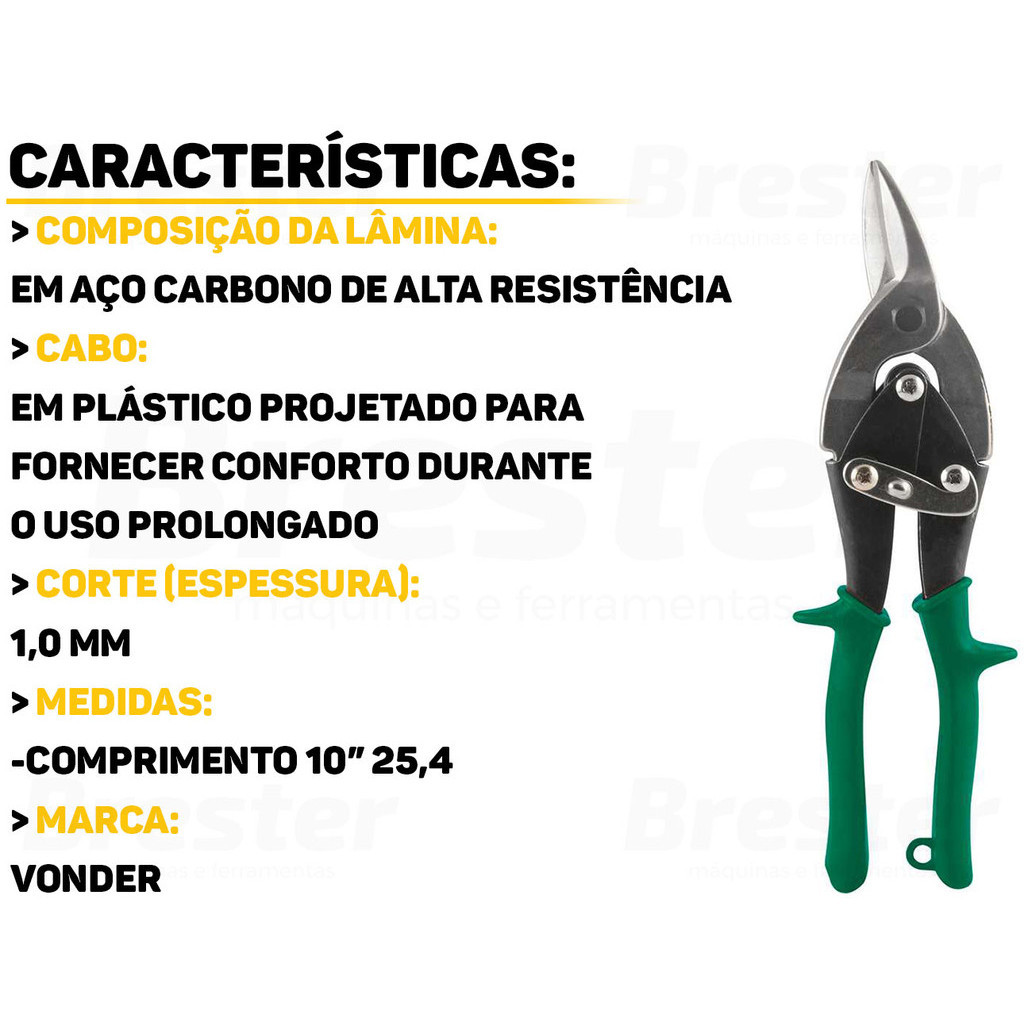 Olá, Bem vindo a Distribuidora Brester. Trabalhamos com uma grande variedade de ferramentas elétricas e manuais, descartáveis, eletroeletrônicos, artigos para casa, artigos de petshop e outros. Aqui você encontrará Produtos Originais, Nota Fiscal, Pronta Entrega e Envio Imediato! Informações do Produto: Tesoura Aviação Direita Vonder Cansado de tesouras que não cortam como deveriam? A Tesoura Aviação Direita Vonder é a solução perfeita para cortes precisos, tornando sua experiência de trabalho mais eficiente e menos cansativa. Construída com materiais de alta qualidade, garantindo longa vida útil. Características: > Possui cabo plastificado; > Utilizada em funilarias, serralherias e indústrias; > Indicada para cortes à direita em chapas macias de até 1,0mm de espessura. Especificações Técnicas: > Material do cabo: plástico; > Comprimento da tesoura: 10"; > Peso aproximado: 391 gramas; > Material da lâmina: aço carbono; > Tipo de corte da tesoura: corte à direita; > Capacidade de corte (espessura): 1,0mm; > Acabamento da lâmina da tesoura: polido. - Marca: Vonder - Garantia: 90 dias contra defeitos de fabricação Vantagens de comprar na Brester: - Nota fiscal para Pessoa Física e Pessoa Jurídica; - Produto novo, com garantia de fábrica; - Produto a pronta entrega; - Envio em até 24hs em dias úteis após confirmação do pagamento. Obrigado por escolher a Brester Máquinas.