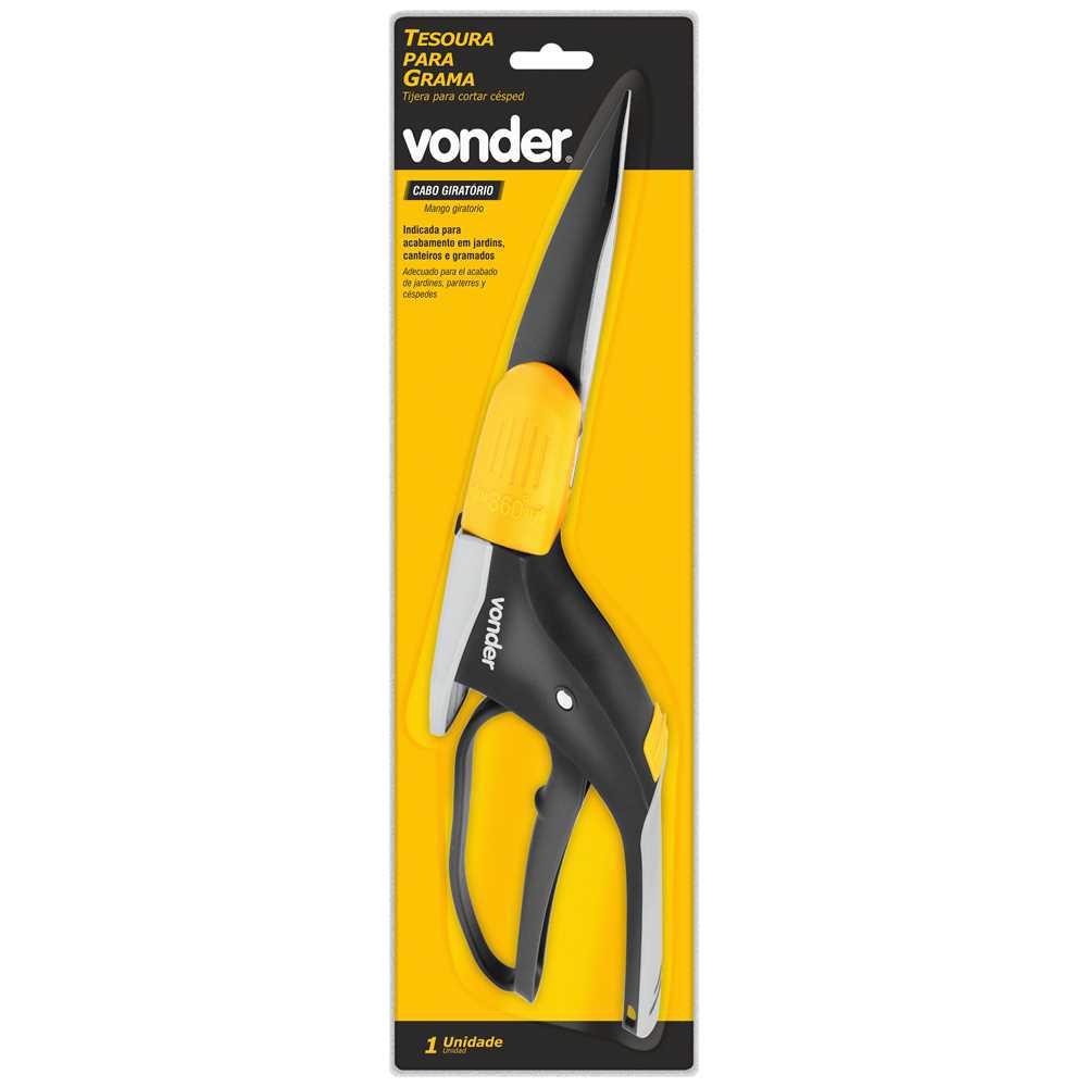 Tesoura para Grama com Cabo Giratório VONDER Leve, prática e de fácil manuseio Possui cabo plástico com revestimento emborrachado e botão trava das lâminas, para maior segurança e fácil armazenamento com a lâmina fechada Conta ainda com cabeça giratória 360° para uso em diversas posições Indicada para acabamento em jardins, canteiros e gramados, para aparar cantos onde o cortador de grama não alcança Pode também cortar pequenos arbustos DADOS TÉCNICOS: Comprimento da lâmina: 150 mm Material do cabo da tesoura para cortar grama:Plástico Comprimento total: 360 mm Massa aproximada (peso): 0.25 kg Garantia: 3 Meses Referência: 3085000360 Marca: VONDER *Imagens meramente ilustrativas.