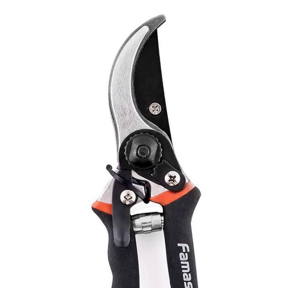 A Tesoura Para Poda Profissional Famastil 8 Polegadasé a ferramenta ideal para quem busca qualidade e eficiência no cuidado de jardins, hortas e pomares. Fabricada com aço SAE 1045 temperado por indução, esta tesoura apresenta uma lâmina extremamente resistente e afiada, garantindo cortes precisos em galhos, brotos e plantas frutíferas. Seu design robusto e a tecnologia de tempera por indução asseguram uma lâmina que se mantém afiada por muito mais tempo, proporcionando durabilidade e alto desempenho mesmo em usos intensivos. Detalhes do produto: Cabo Emborrachado Superatômico: Proporciona conforto e ergonomia, adaptando-se às mãos do usuário e minimizando o esforço em longas sessões de poda. Leveza: Design leve que facilita o manuseio e aumenta a eficiência durante o uso prolongado. Versatilidade: Ideal para cortar galhos, brotos e plantas frutíferas com precisão e facilidade. Cartela de Auto Serviço: A lâmina pode ser facilmente afiada, prolongando a vida útil da tesoura e mantendo seu desempenho.