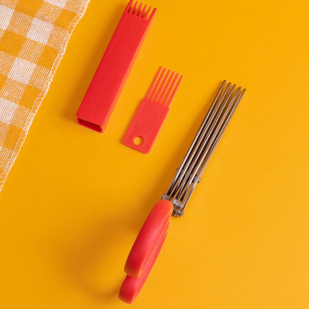 :: Essa é a tesoura para temperos da MOZCADA. :: Prática: são 5 lâminas de corte que cortam 5x mais rápido do que faca ou tesoura comum. :: Revestida com silicone: sua mão não escapa durante o corte de salsinhas, cebolinhas, coentro, hortelã, boldo, manjericão e outros temperos. :: Resistente e durável: feita de aço inox, silicone e plástico. Dimensões do produto: Comprimento: 19,5cm Altura: 10,8 cm