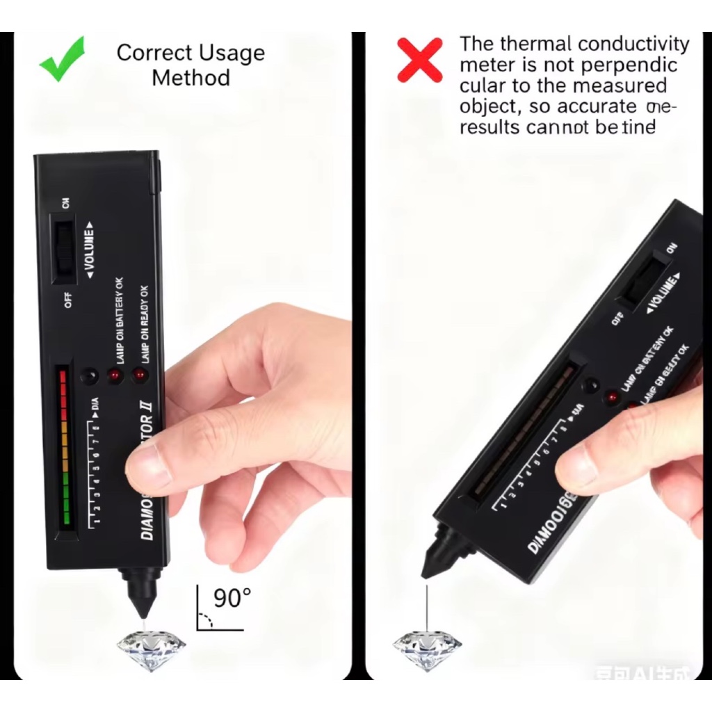 Operação fácil. Indicação de resultados por luz LED e áudio. A luz vermelha será mostrada e o indicador de áudio sonorizará se a pedra for um verdadeiro diamante. Calibração simples para pedras de vários tamanhos. Leitura precisa e confiável. Acompanhado de uma plataforma de teste para pedras soltas Leve, acompanhado de uma prática bolsa de transporte. Manual de instruções detalhado está incluído no pacote. Manutenção e reparo: O instrumento é muito sensível à sonda, deve ser especialmente cuidadoso na proteção, não deve ser usado sem colocar na capa. A preparação da luz indicadora é muito escurota, mostrando que a bateria está quase esgotada, deve ser substituída de forma oportuna. Se o instrumento não for usado por um longo período, remova a bateria. 不 4. Para uma detecção precisa, a correção proposta é uma • por ano.