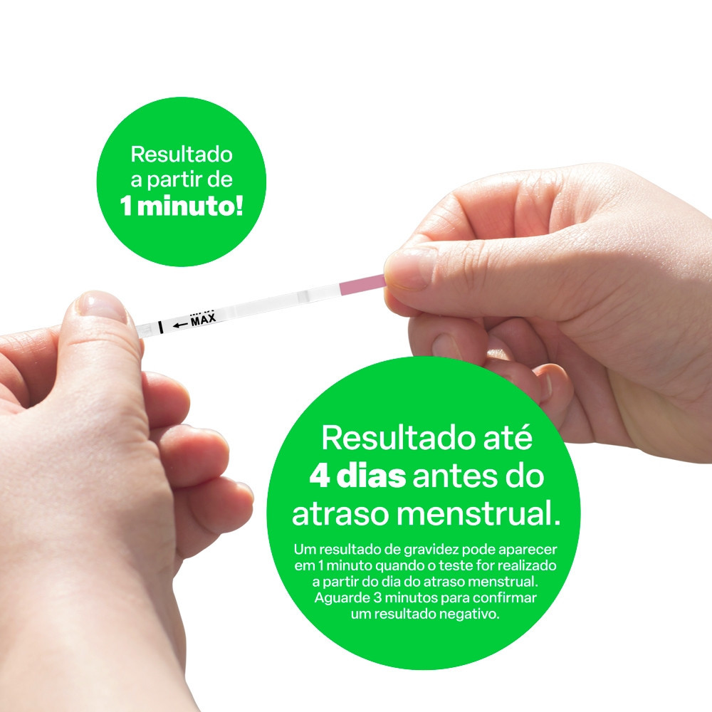 Multi Saúde Baby Test: teste de gravidez em tira com copo coletor Resultado em menos de 1 minuto. Mais de 99 de precisão Confiável e seguro. Para garantir a eficácia, realize o teste a partir do último dia esperado para a menstruação. Não muda a sua rotina Faça o teste no momento do dia em que preferir, sem alterar a eficácia. Não precisa esperar Você também pode fazer o teste até quatro dias antes do atraso menstrual, sem alterar a eficácia. Aguarde até cinco minutos para confirmar os resultados. Completo O Multi Saúde Baby Test acompanha um copo coletor. Ficha Técnica Marca: Multi Saúde Modelo: Baby Test Teste de gravidez em tira com copo coletor Multi Saúde - HC364 Cor: Branco Peso do produto: 1g Largura do produto: 2.9cm Altura do produto: 7.2cm Comprimento do produto: 11.9cm Conteúdo da Embalagem: 1 teste de gravidez em tira, 1 manual de instruções e 1 copo coletor Garantia: 1 Ano *Imagens meramente ilustrativas.