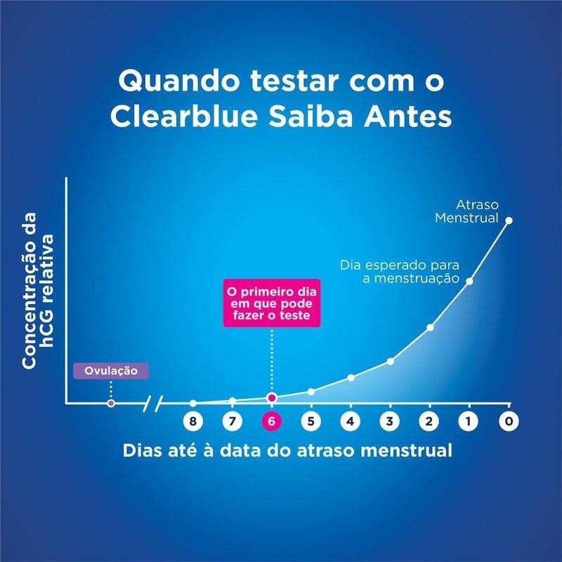 O Teste de Gravidez Clearblue te fornece resultados 6 dias antes do atraso menstrual (5 dias antes do dia esperado para a menstruação), com uma precisão de 99,9% a partir do dia esperado para a menstruação. • Teste antecipadamente: resultados até 6 dias antes do atraso menstrual (5 dias antes do dia esperado para a menstruação); • O nosso teste mais sensível - sensibilidade de 10 mIU/ml hCG; • 99,9% de precisão a partir do dia esperado para a menstruação; • Resultados fáceis de ler; • Fácil de usar: cabo ergonômico, ponta larga com alteração da cor e Tecnologia Floodguard; • A marca N.° 1 em vendas no mundo".